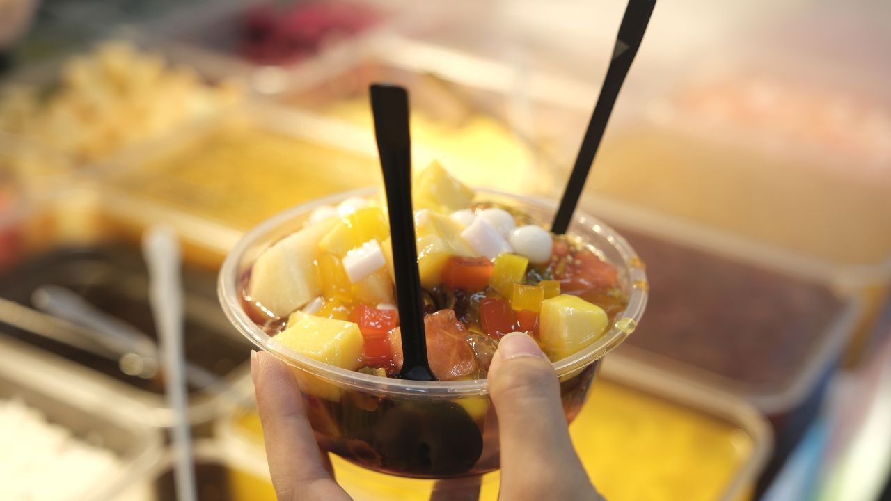3. ตักวุ้นใส่ถ้วย เติมน้ำแข็งบด ราดน้ำเชื่อม และใส่ท็อปปิ้งตามใจชอบ