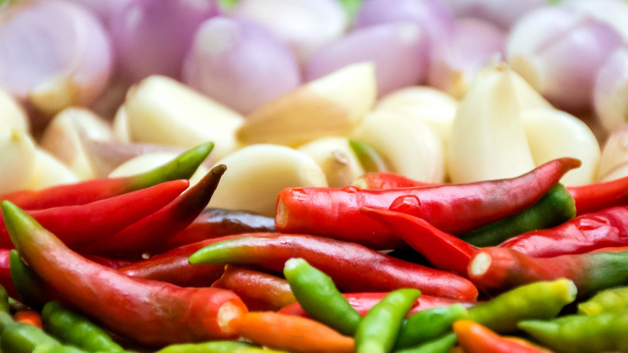 1. นำพริกจินดา กระเทียม และหอมแดงลงไปคั่วจนเหลือง หอม