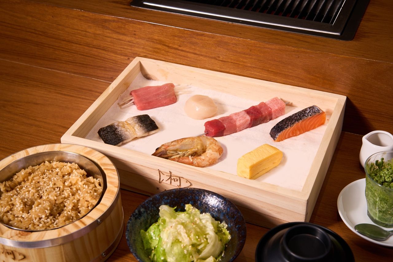 เซ็ตนี้ยังประกอบด้วย Salmon ปลาแซลมอนนำเข้าย่างซอส, Unagi ที่มีจุดเด่นคือหนังที่ย่างจนกรอบตัดกับเนื้อสัมผัสที่นุ่ม สามารถเลือกเพิ่ม “Uni” หรือไข่หอยเม่นได้