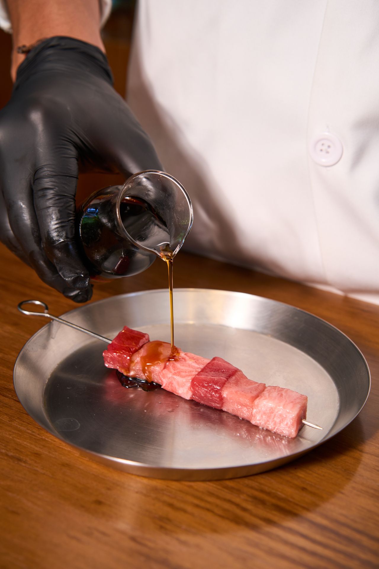 เซ็ตนี้เริ่มต้นด้วย Chutoro Leek (ชูโทโร่หรือทูน่าส่วนท้องไขมันปานกลาง แทรกด้วยต้นหอมสด ตามด้วย Hotate หอยเชลล์โฮตาเตะย่างซอสสูตรพิเศษ ก่อนจะนำเสนอไฮไลต์อย่าง “Shade of Toro” ที่มีเฉพาะสาขานี้ เป็นการรวมปลาทูน่า (มากุโระ) 3 ส่วนที่มีระดับไขมันต่างกัน (โอโทโร่, ชูโทโร่, อากามิ) มาเสียบไม้ย่างจนเกิดเป็น “สามเฉดสี” ที่มอบรสสัมผัสแตกต่างกันอย่างชัดเจนในคำเดียว