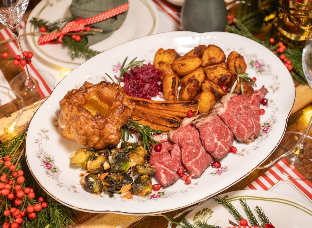 Festive Wagyu Roast: เนื้อวากิวส่วนพิคานย่า (Picanha) ระดับ MB5 ย่างอย่างพิถีพิถัน เสิร์ฟคู่กับยอร์คเชียร์พุดดิ้ง แครอท บรัสเซลส์สเปราต์ กะหล่ำปลีม่วงดอง และซอสเนื้อเข้มข้น (Beef Jus)