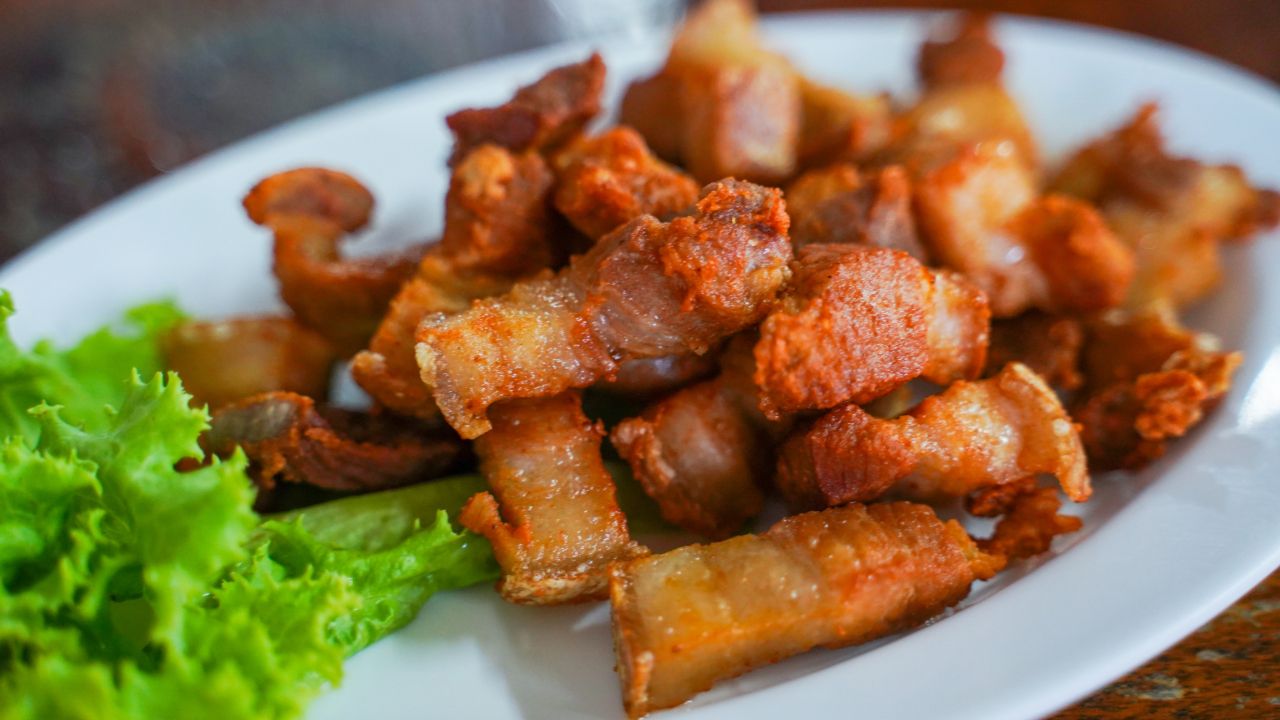 หมูสามชั้นหั่นชิ้นพอดีคำ ทอดจนหนังกรอบเนื้อฉ่ำ เสียงกรอบดังถูกใจตั้งแต่คำแรก กินคู่กับน้ำจิ้มแจ่วหรือน้ำพริกก็เข้ากันดี เป็นเมนูกับแกล้มที่หมดเร็วทุกครั้ง เหมาะสำหรับวงสังสรรค์ยามค่ำคืน