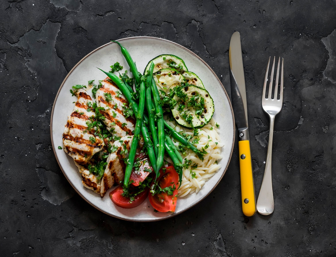 - มื้อกลางวัน: อกไก่ย่างกับข้าวกล้องและผักต้ม