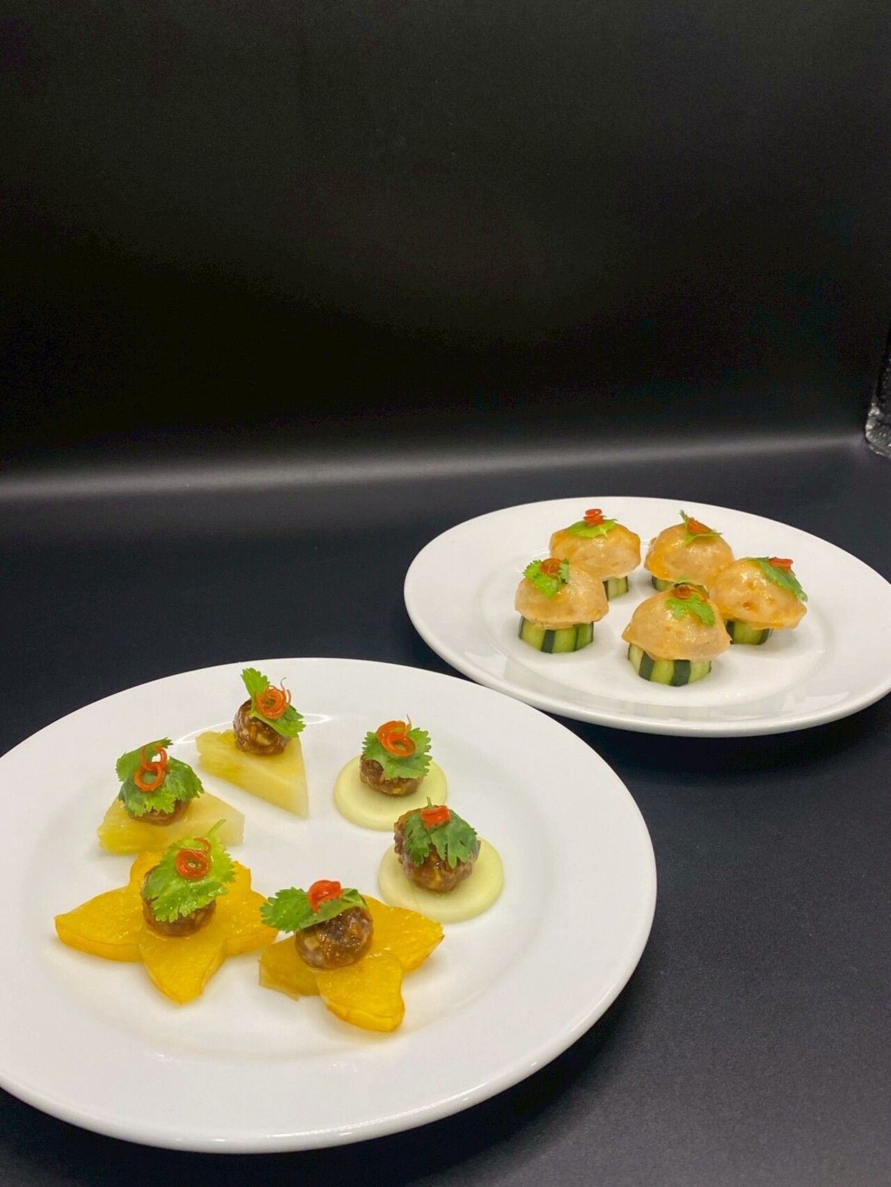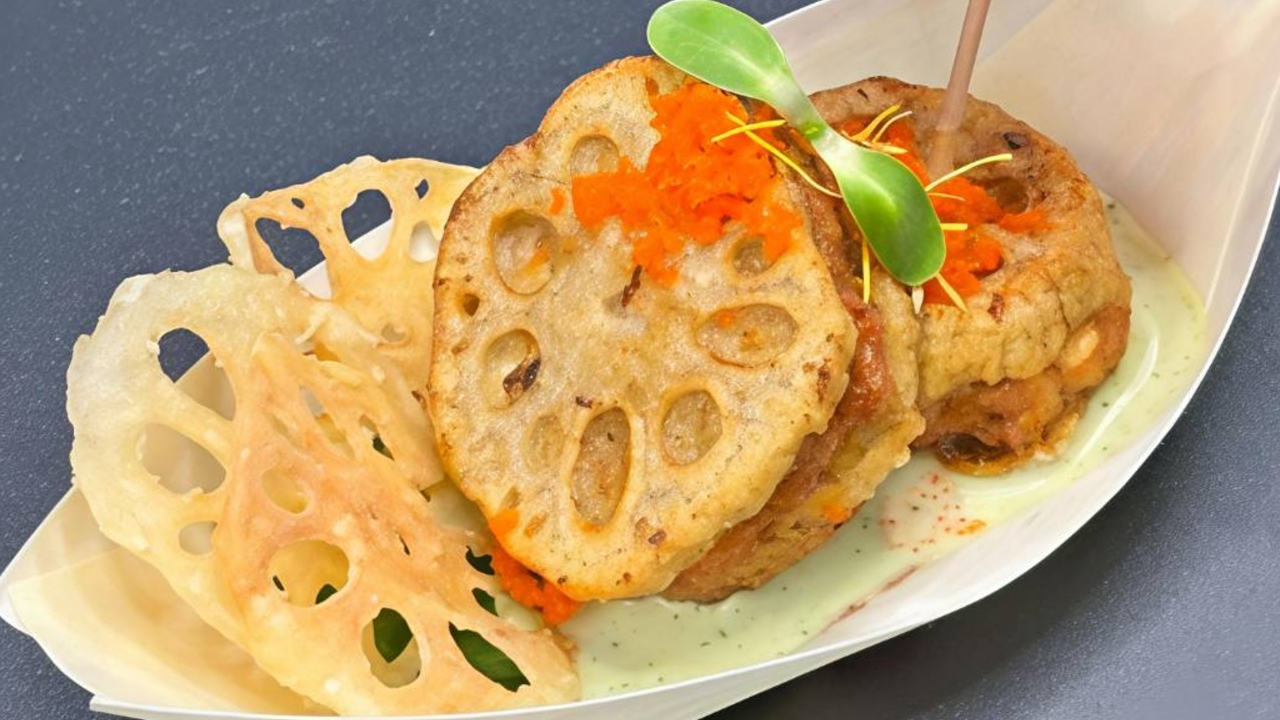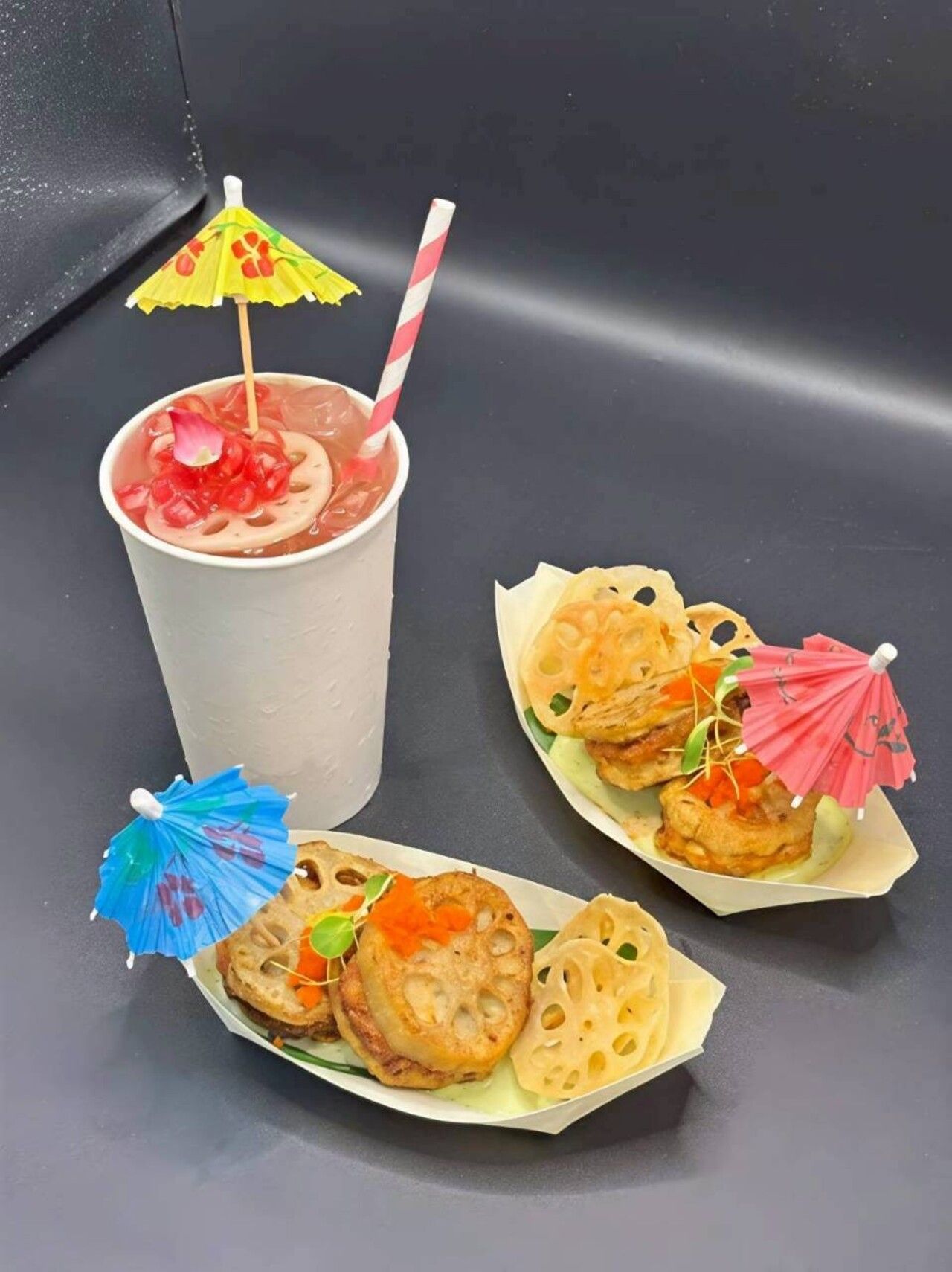 ภายใต้แนวคิด Zero Waste ที่สอดคล้องกับธีมงานอย่างที่สุด เด็กๆ กลุ่มร้าน "บงกช" เลือกหยิบวัตถุดิบไทยๆ อย่าง "บัว" มาใช้ประโยชน์ในทุกมิติ โดยนำเสนอมุมมองใหม่ของ "รากบัว" ที่คนส่วนใหญ่มักเห็นแค่ในน้ำแกงจืด น้องๆ นำรากบัวมาสไลซ์เป็นแผ่นบางเท่ากัน นำไปทอดจนเหลืองกรอบ สอดไส้ด้วยกุ้งและไก่ที่ผสมเม็ดบัวลงไปเพื่อเพิ่มเนื้อสัมผัสความมัน เคี้ยวเพลิน ทานคู่กับซอสซีฟู้ดมาโยที่ช่วยตัดเลี่ยนได้อย่างลงตัว ไม่เพียงเท่านี้ ส่วนของรากบัวที่เหลือจากการทำอาหาร ยังถูกนำไปต้มสกัดเป็นน้ำชารากบัวผสมเกสรบัว กลิ่นหอมละมุน ทานคู่กับ "ไข่มุกไหลบัว" ที่ให้ความหนึบหนับ เป็นชุดอาหารว่างที่คิดมาแล้วอย่างรอบคอบเพื่อลดขยะอาหารให้เหลือศูนย์
