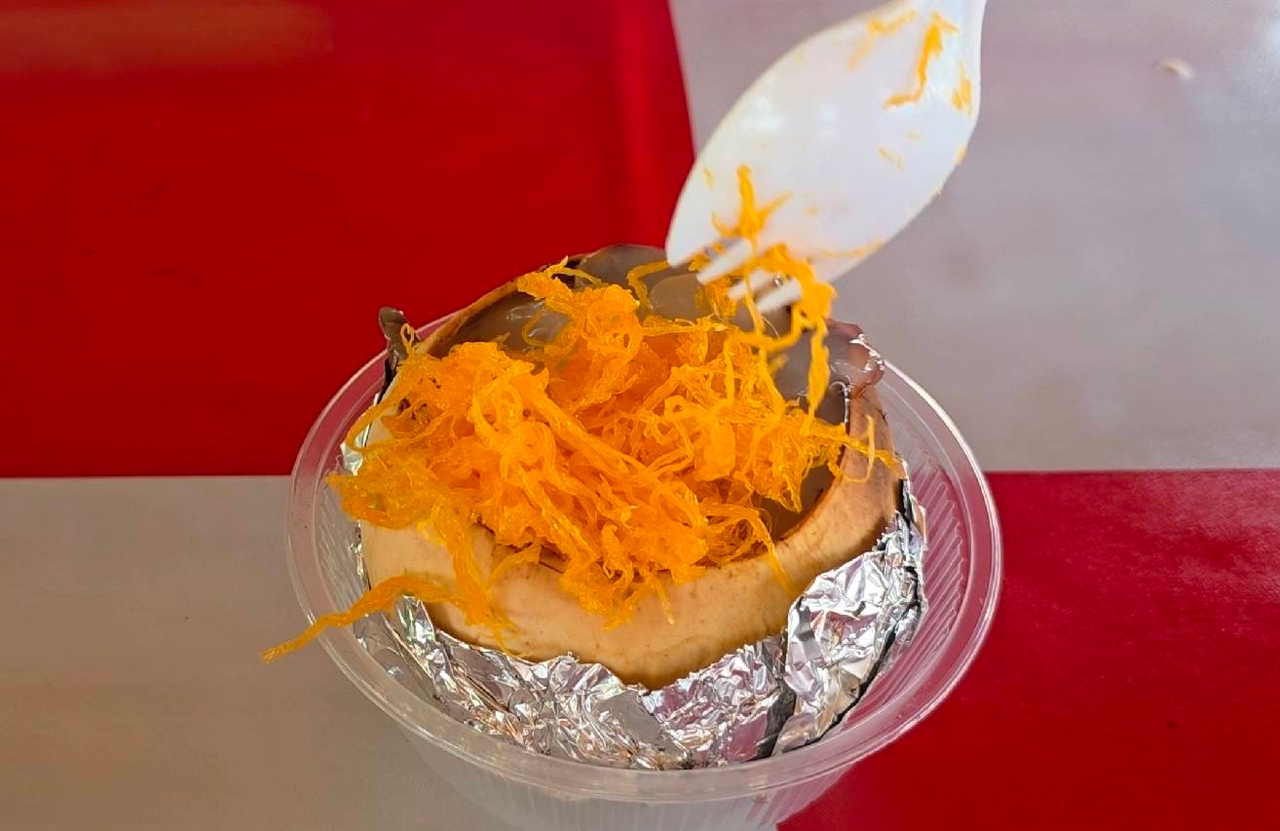พร้อมกันนี้ ทางร้านยังมีท็อปปิ้งให้เสริมความอร่อย เช่น ฝอยทอง มันเชื่อม ลูกตาล ลูกชิด เผือก และมะพร้าวอ่อน ในราคาลูกละ 40 บาท และเลือกเครื่องเคียงได้ 3 อย่าง