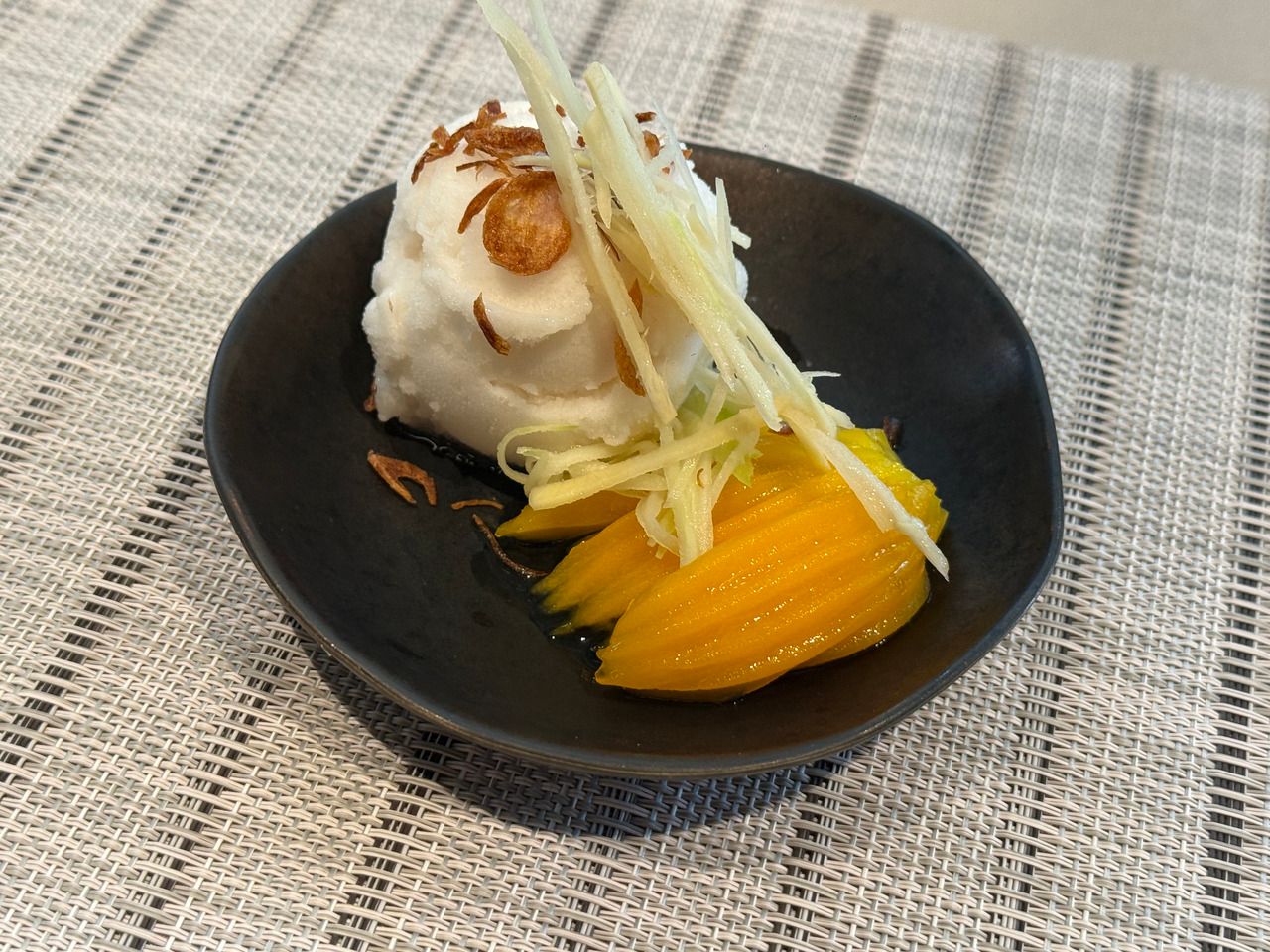 ปิดท้ายฤดูร้อนด้วยของหวานที่ขาดไม่ได้ ด้วยการคัดสรรมะยงชิดเกรดพรีเมียมจากจังหวัดนครนายก เสิร์ฟในไอศกรีมส้มฉุน โรยด้วยหอมเจียวและขิงอ่อนซอย ให้ความหอมเย็นชื่นใจ