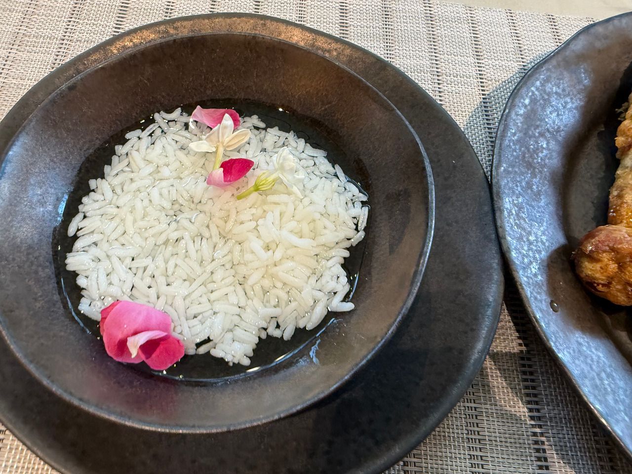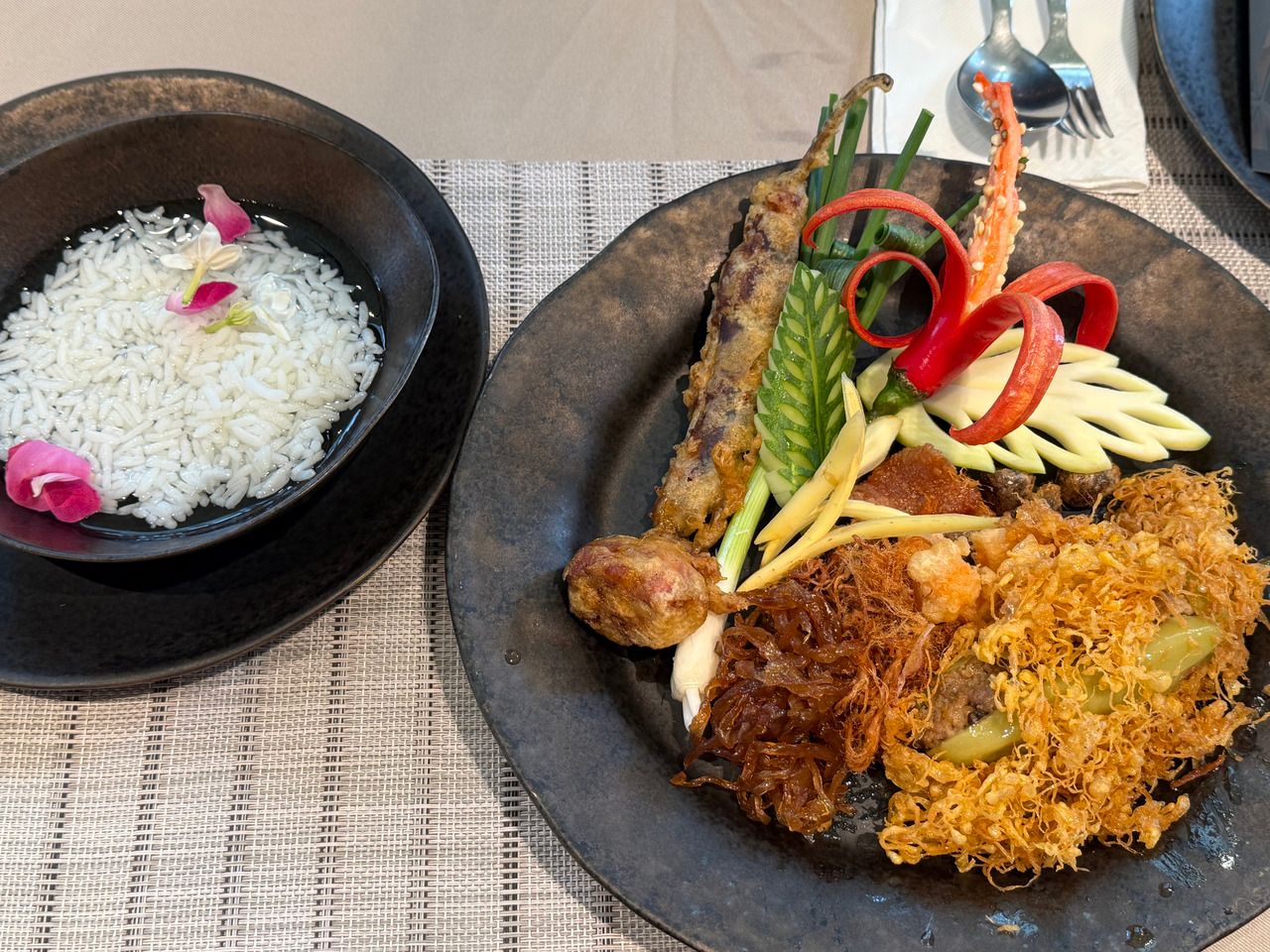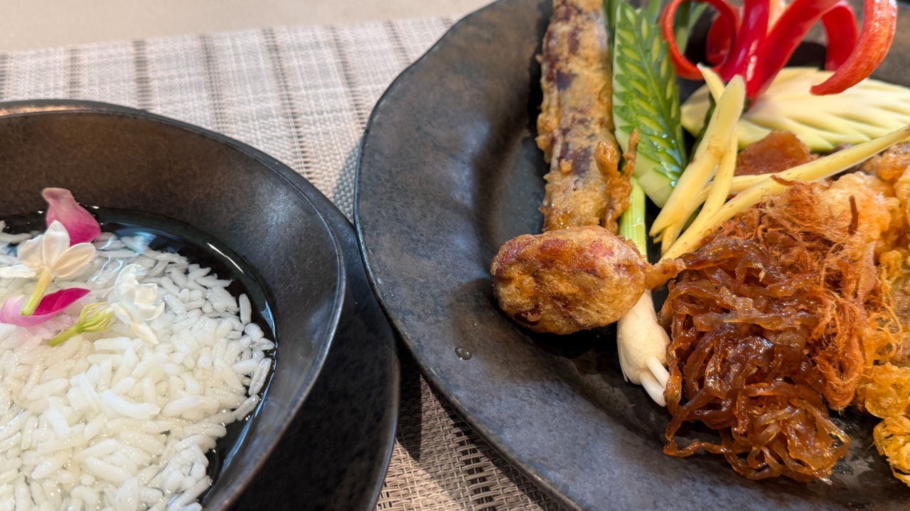 เริ่มต้นที่ "ลูกกะปิ" คำแรกของเครื่องเคียงที่ควรรับประทานคือ "ลูกกะปิ" แล้วตามด้วยข้าวและน้ำแร่ ตามด้วยดอกจำปีที่แกะสลักจากกระชาย และพริกชี้ฟ้าแดง