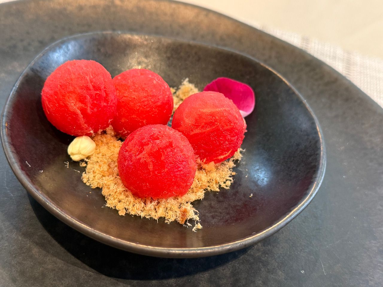 เริ่มต้นกระตุ้นต่อมรับรสด้วยเมนูโบราณตั้งแต่สมัยอยุธยา ใช้แตงโมเนื้อดีรสหวานฉ่ำ รับประทานคู่กับปลาแห้งที่คัดสรรปลาช่อนแดดเดียวจากจังหวัดสิงห์บุรี นำมาย่างเตาถ่าน โขลกให้ฟู แล้วผัดให้แห้ง ปรุงรสกลมกล่อมด้วยน้ำตาลโตนดจากจังหวัดสมุทรสงคราม ดอกเกลือ และหอมเจียว