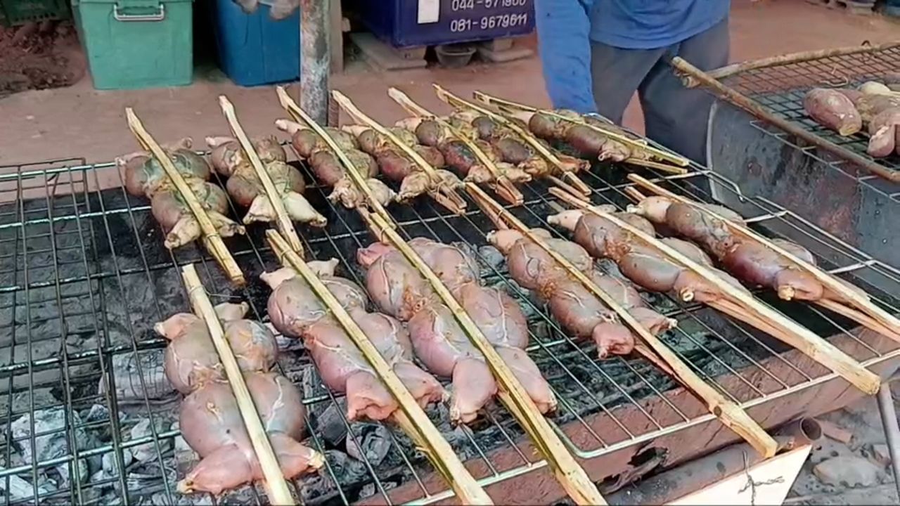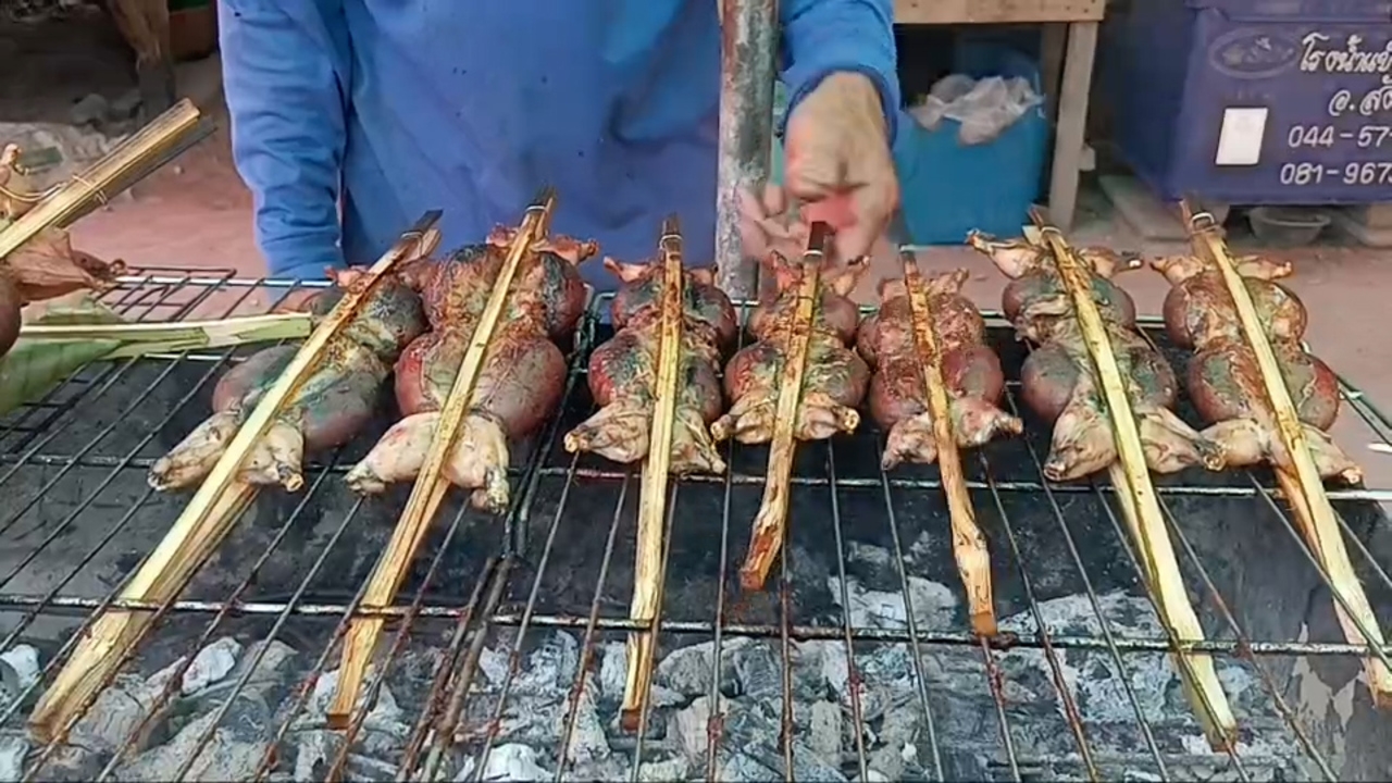 หากใครมีโอกาสแวะเวียนไปที่ ตลาดชุมชนป่าสนสองใบหนองคู ในวนอุทยานป่าสนหนองคู อ.สังขะ จ.สุรินทร์ ท่ามกลางบรรยากาศร่มรื่นและวิถีชีวิตอันเรียบง่ายของชาวบ้าน คุณจะได้กลิ่นหอมกรุ่นของสมุนไพรย่างเตาถ่านลอยเตะจมูกมาแต่ไกล กลิ่นหอมยั่วน้ำลายนั้นมาจาก “อังแกบบอบ” อาหารพื้นบ้านอีสานใต้ระดับตำนาน ที่กำลังถูกย่างร้อนๆ ส่งตรงจากเตาที่ ป้าสุวรรณ คัทมาส วัย 64 ปี และลุงประทีป คัสมาส วัย 63 ปี สองสามีภรรยาที่สืบทอดภูมิปัญญาความอร่อยนี้มาอย่างยาวนาน