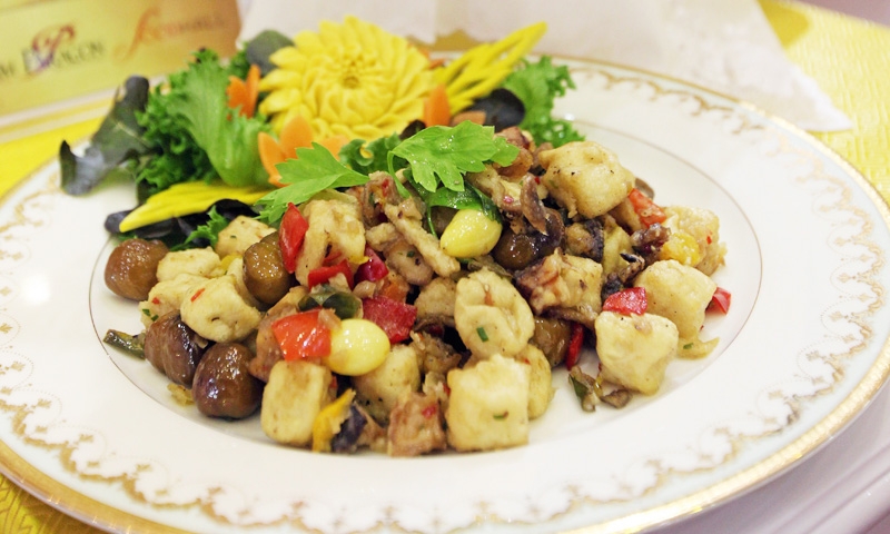 วิธีทำ 1) เจียวไช้โป๊หวาน พร้อมพริกชี้ฟ้า ในน้ำมันข้าวโพด จนมีกลิ่นหอม 2)ใส่เต้าหู้ พร้อมเครื่องปรุงที่เหลือซึ่งคลุกแป้งทอดไว้แล้วลงไปผัดจนเข้ากัน 3) ปรุงรสด้วยเครื่องปรุงรส เมื่อชิมได้รสตามชอบแล้ว โรยหน้าด้วยขึ้นฉ่าย แล้วตักขึ้นจากกระทะเลย 4) เวลาจะรับประทานให้ห่อเต้าหู้ผัดพริกทรงเครื่องด้วยผักสลัด ก็จะได้สารอาหารตรึม เฉพาะเห็ดและผักทั้งหลาย อุดมด้วยใยอาหารไนอะซิน ช่วยบำรุงกำลัง กระตุ้นภูมิคุ้มกันของร่างกาย ช่วยระบบขับถ่ายทำงานได้ดีขึ้น ส่วนเต้าหู้ขาว อุดมด้วยโปรตีน แคลเซียม วิตามินบี บำรุงร่างกายและผิวพรรณ, แปะก้วย-เกาลัด ช่วยบำรุงสมอง ลดความเสี่ยงต่อโรคอัลไซเมอร์ ช่วยให้ระบบไหลเวียนโลหิตทำงานเป็นปกติ