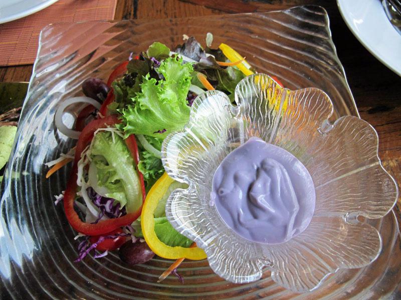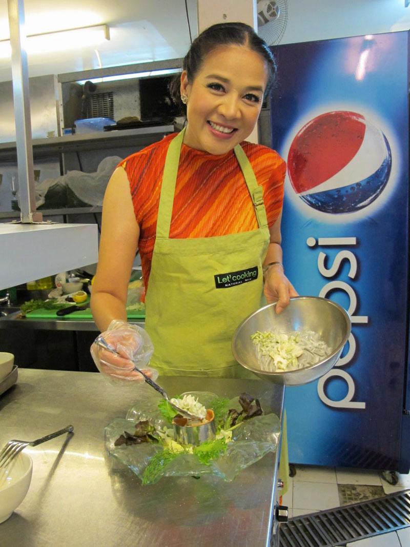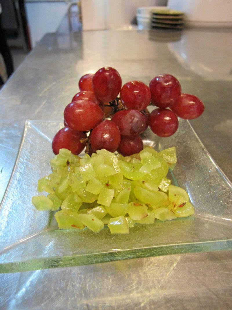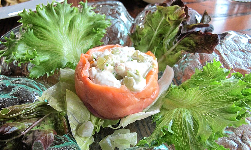 วิธีทำ 1) คลุกเนื้อปูกับมายองเนสอย่างเบาๆมือ ระวังอย่าให้เนื้อปูแหลก 2) ใส่องุ่นปอกเปลือกที่หั่นชิ้นลูกเต๋าลงผสม 3) ใส่วาซาบิตามชอบเพื่อตัดความเลี่ยน 4) ปรุงรสด้วยเกลือ-พริกไทย และบีบน้ำเรมอนลงผสม จากนั้นโรยแตงกวาญี่ปุ่นซอยละเอียด และคลุกเคล้าให้เข้ากัน 5) นำเนื้อปลาแซลมอนรมควันพันรอบพิมพ์วงกลมด้านใน 6) ตักเนื้อปูที่คลุกรวมกับส่วนผสมทั้งหมด ใส่ลงในพิมพ์ที่กรุเนื้อปลาไว้ 7) เคาะเนื้อปลาแซลมอนออกจากพิมพ์ และแต่งรอบจานด้วยผักสลัดและผักชีลาว พร้อมเหยาะน้ำสลัดบัลซามิกที่ผักสลัด และหยดไปรอบๆจานให้ดูสวยงาม.