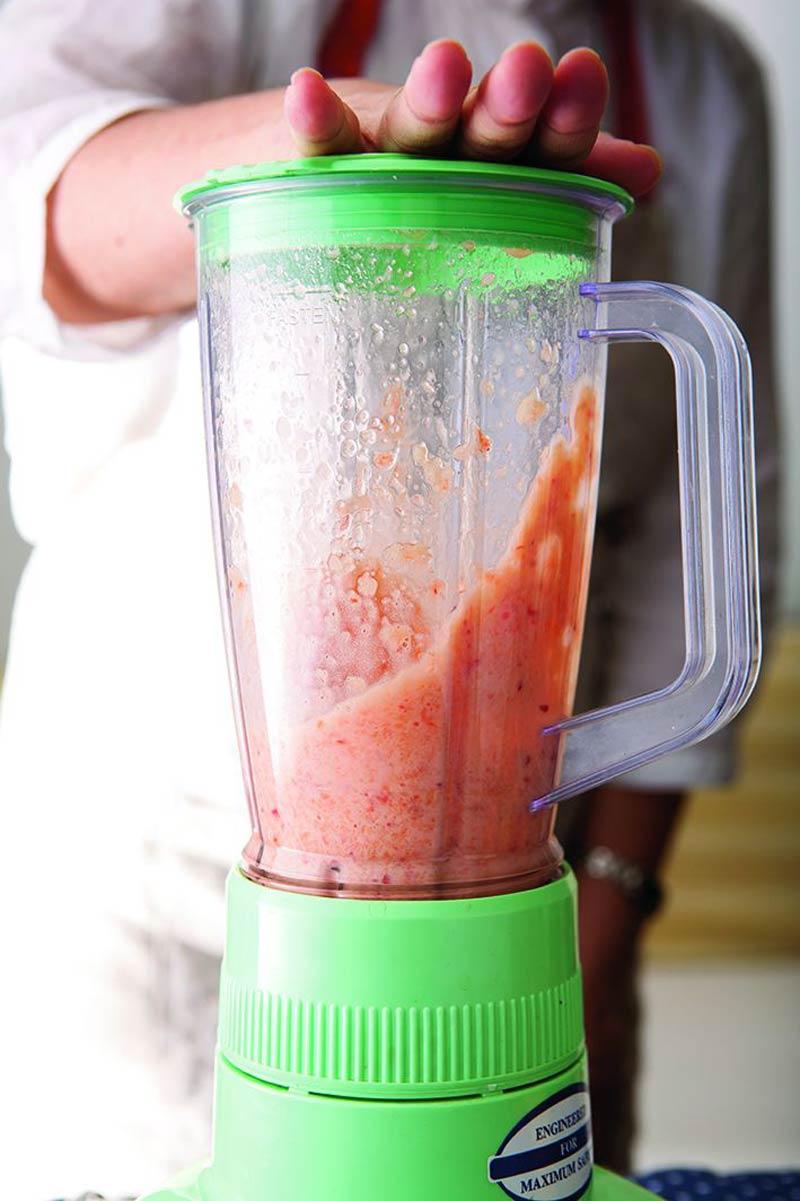 ปั่นส่วนผสมทุกอย่างรวมกัน ยกเว้นบุกและพริกแห้ง เทเครื่องดื่มใส่แก้วที่ใส่น้ำแข็งแล้วตกแต่งด้วยบุกและพริกแห้ง ดื่มทันที