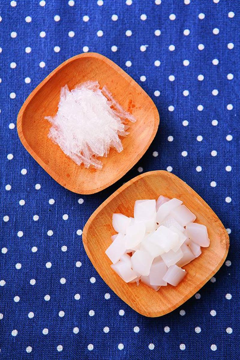 บุกหั่นเต๋าลวกน้ำร้อนและพริกแห้งซอยบางสำหรับตกแต่ง