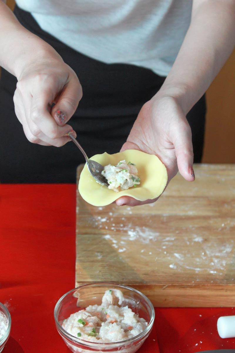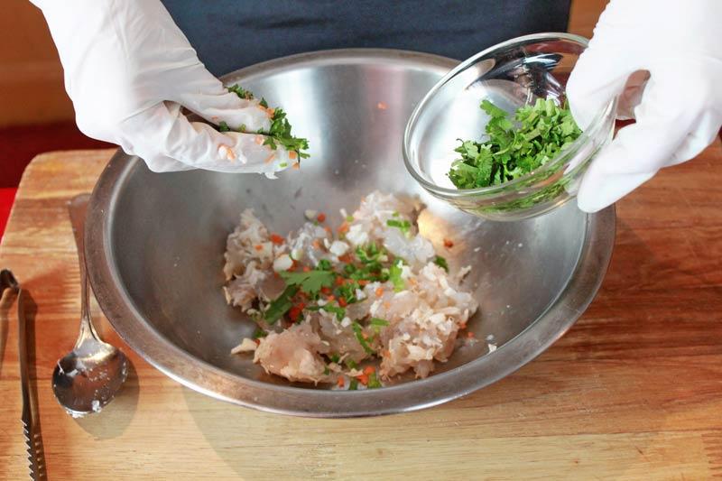 ส่วนผสมของไส้ : กุ้งแชบ๊วยสับละเอียด 100 กรัม/เนื้อปูสับละเอียด 100 กรัม/มันหมู 10 กรัม/ผักชีหั่น 1 ต้น/ต้นหอมซอย 1 ต้น/แห้วสับละเอียด 10 กรัม/แครอทสับละเอียด 10 กรัม/เกลือ 1/2 ช้อนชา/น้ำมันงา 1 ช้อนชา/แป้งมัน 1 ช้อนชา/น้ำตาลทราย 2 ช้อนชา/พริกไทย 1/2 ช้อนชา