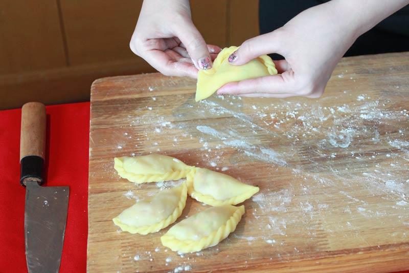 วิธีทำ 1) แกะเปลือกกุ้งออกให้หมดแล้วผ่าหลังเอาเส้นดำกลางหลังกุ้งออก จากนั้นล้างกุ้งด้วยแป้งมันผสมน้ำให้สะอาด แล้วใส่ตะกร้าให้กุ้งสะเด็ดน้ำ 2) สับกุ้งให้ละเอียด แล้วนำไปผสมกับมันหมูสับละเอียด พร้อมกับใส่เกลือ น้ำตาล พริกไทยป่น แป้งมันที่ตวงไว้แล้วคลุกเคล้าให้เข้ากัน 3) ใส่เนื้อปู แครอท แห้วสับละเอียด ต้นหอม ผักชี นวดให้เข้ากัน จึงใส่น้ำมันงาลงไปเป็นส่วนผสมสุดท้าย 4) นำแป้งฮะเก๋า แป้งมันฮ่องกง แป้งคัสตาร์ด มาผสมกับ น้ำร้อน นวดให้เข้ากัน แป้งคัสตาร์ดเมื่อ โดนน้ำจะกลายเป็นสีเหลือง นวดจนแป้งเข้ากันดีเป็นเนื้อเดียวกัน แล้วจึงแบ่งแป้งเป็นก้อนๆ เล็กๆ จากนั้นใช้ไม้คลึงแป้งให้เป็นแผ่นบางกลม 5) ตักไส้วางตรงกลางแผ่นแป้ง แล้วพับครึ่งพร้อมกับจับจีบตรงขอบ (คล้ายกับการห่อกะหรี่ปั๊บ) 6) ตั้ง กระทะใส่น้ำมันให้ร้อน จึงนำฝั่นโก๋ที่ห่อเสร็จแล้วลงทอดด้วยไฟปานกลาง จนสุกหรือแป้งเป็นสีเหลืองทอง ค่อยตักขึ้น พักให้สะเด็ดน้ำมัน จึงนำออกเสิร์ฟ.