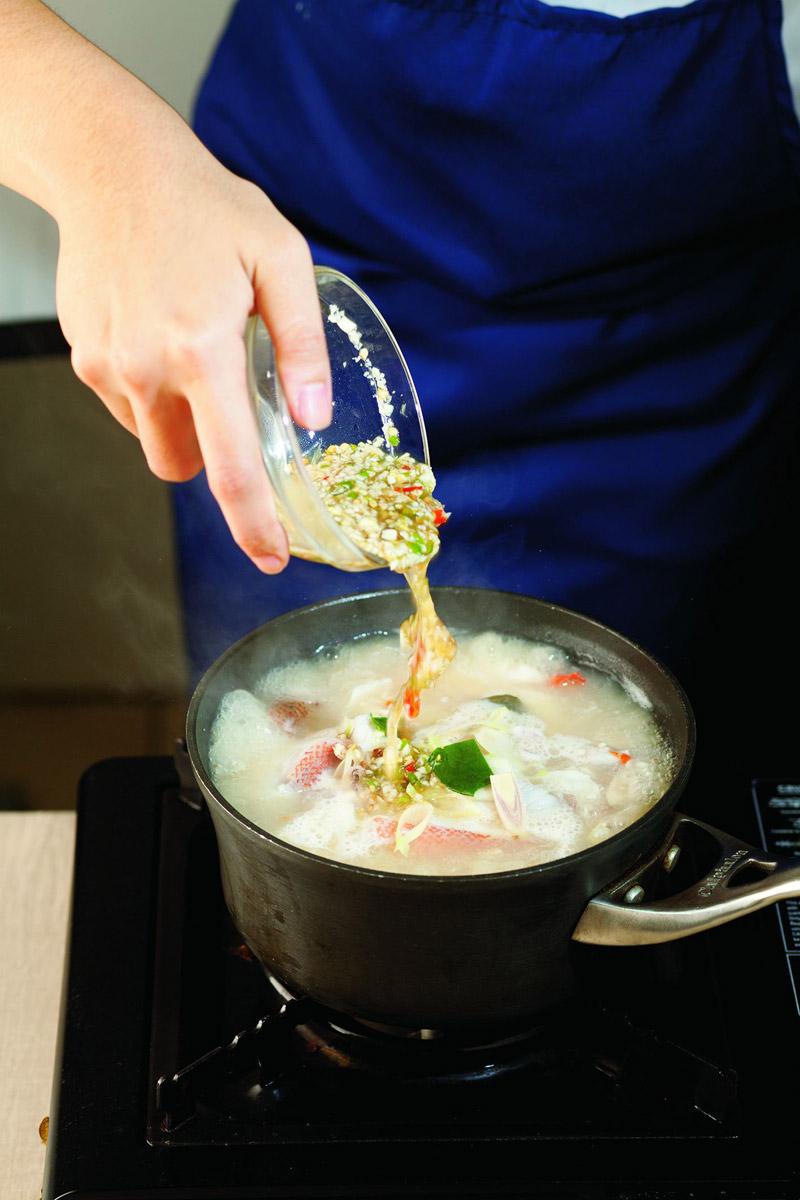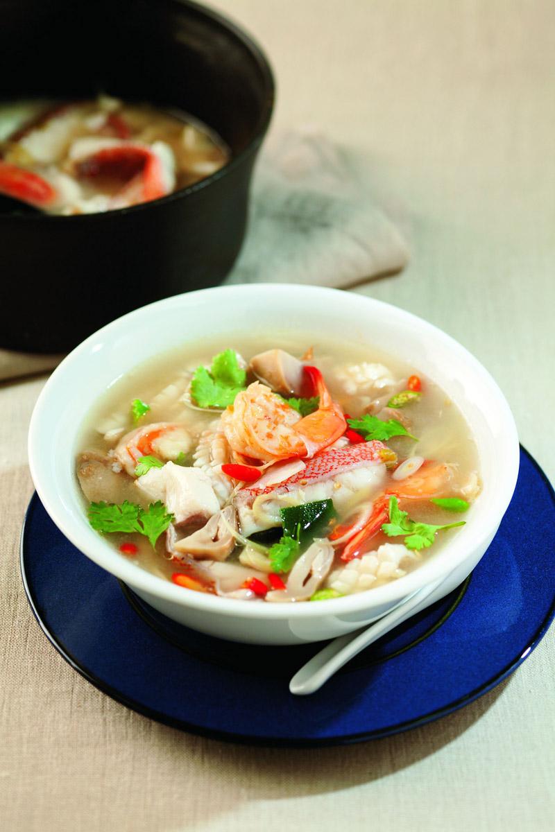 ส่วนผสม (สำหรับ 1-2 ที่) เตรียม 4 นาที ปรุง 6 นาที, กุ้งทะเลปอกเปลือกผ่าหลังล้างให้สะอาด 3 ตัว, ปลาหมึกกล้วยใช้มีดบั้งเป็นลาย หั่นเป็นชิ้น 1 ตัว, เนื้อปลาเก๋าแดงหั่นชิ้นหนา 1/2 นิ้ว 6 ชิ้น, เห็ดฟางผ่าสี่ 5 ดอก, ตะไคร้หั่นแฉลบบางๆ 2 ช้อนโต๊ะ, ข่าหั่นแว่นบาง 1 ช้อนโต๊ะ, ใบมะกรูดฉีก 5-6 ใบ, หอมเล็กปอกเปลือกบุบ 3-4 หัว, น้ำจิ้มซีฟู้ด 1 ถ้วย, ผักชีหั่นท่อน เศษหนึ่งส่วนสี่ถ้วย, น้ำเปล่า 3 ถ้วย