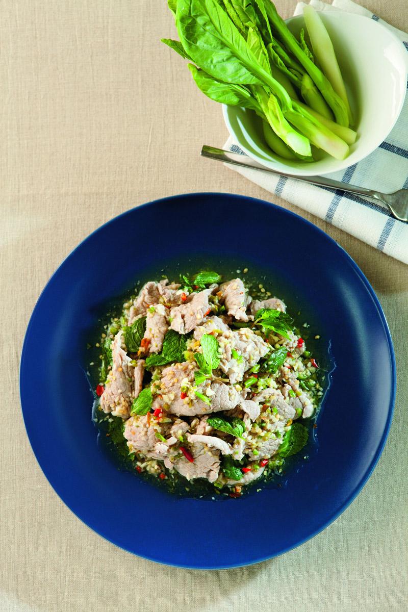 ส่วนผสม (สำหรับ 1-2 ที่) เตรียม 6 นาที ปรุง 2 นาที, เนื้อหมูสันในหั่นชิ้นบาง 300 กรัม, ใบสะระแหน่ ครึ่งถ้วย, น้ำจิ้มซีฟู้ด 1 ถ้วย, ยอดอ่อนและก้านคะน้าลอกเปลือกแช่น้ำเย็นจัด