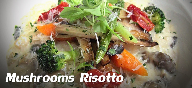 วิธีทำ Mushrooms Risotto : 1) นำข้าว Arborio ดิบไปคั่วจนร้อน 2) ใส่ไวน์ขาวในปริมาณให้เกือบท่วมข้าว แล้วเคี่ยวต่อจนเกือบแห้ง 3) ใส่น้ำสต็อกไก่ลงผสมทีละน้อยๆจนหมด พร้อมกับเหยาะเกลือลงผสม แล้วคนอย่างต่อเนื่องจนมีความข้นออกมาจากข้าว 4) ลองชิมดู พอข้าวใกล้สุกจึงใส่เห็ด 2 ชนิดลงไปส่วนหนึ่ง 5) เติมวิปครีม จากนั้นเคี่ยวไปจนน้ำงวด ข้าวจะข้นขึ้น แต่ถ้าข้าวยังไม่สุกก็ให้เติมน้ำสต็อกไก่ลงไปอีก พอข้าวสุกยกขึ้นจากเตา 6) ใส่เนยแล้วคนให้เนยละลาย จึงใส่พาร์เมซานชีส ถ้ายังไม่เค็มค่อยปรุงรสด้วยเกลือพริกไทย 7) นำผักต่างๆกับเห็ดส่วนที่เหลือหั่นเป็นเส้นๆ ผัดกับน้ำมันมะกอก เห ยาะเกลือ-พริกไทย ให้มีรสชาติ แล้วนำมาราดบนข้าว พร้อมกับมะเขือเทศอบแห้ง ให้ดูมีสีสัน พร้อมเสิร์ฟได้เลย.