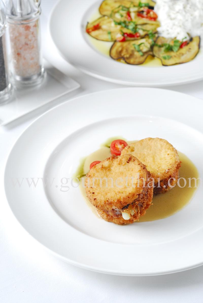 โชคดีว่าในช่วงนี้เชฟฟิลิปโปยังอยู่ จึงจัดอาหารอิตาเลียนจานพิเศษมาให้ชิมหลายจาน โดยเฉพาะ Burrata with Eggplant เชฟใช้เบอราตตา ซึ่งเป็นชีสมอซซาเรลลาชนิดพิเศษจากเมืองปูญา เสิร์ฟคู่กับมะเขือม่วงนาบกระทะที่คลุกเคล้ากับกระเทียมและน้ำมันพริก จานนี้ได้ความสดชื่นของชีสที่นุ่มมันกับความเผ็ดของน้ำมันพริกและความหอมของกระเทียม จานต่อมา Mozzarella in carrozza ขนมปังทอดสอดไส้ชีสมอซซาเรลลา ราดด้วยซอสที่ทำจากแอนโชวี่ เนย และน้ำสต๊อกปลา เนื้อนอกกรอบและนุ่มเนียนด้วยชีสที่สอดไส้ไว้ ต่อกันที่สลัด Avocado Bernardo สลัดอะโวคาโดใส่มายองเนสแล้วคลุกเคล้ากับมะเขือเทศ กุ้งตัวเล็ก ล็อบสเตอร์ แลงกุสทีน บรั่นดี ทาบาสโก ปาปริกา วูสเตอร์ซอส ได้รสเปรี้ยวตัดกับความมันอร่อยของอะโวคาโด