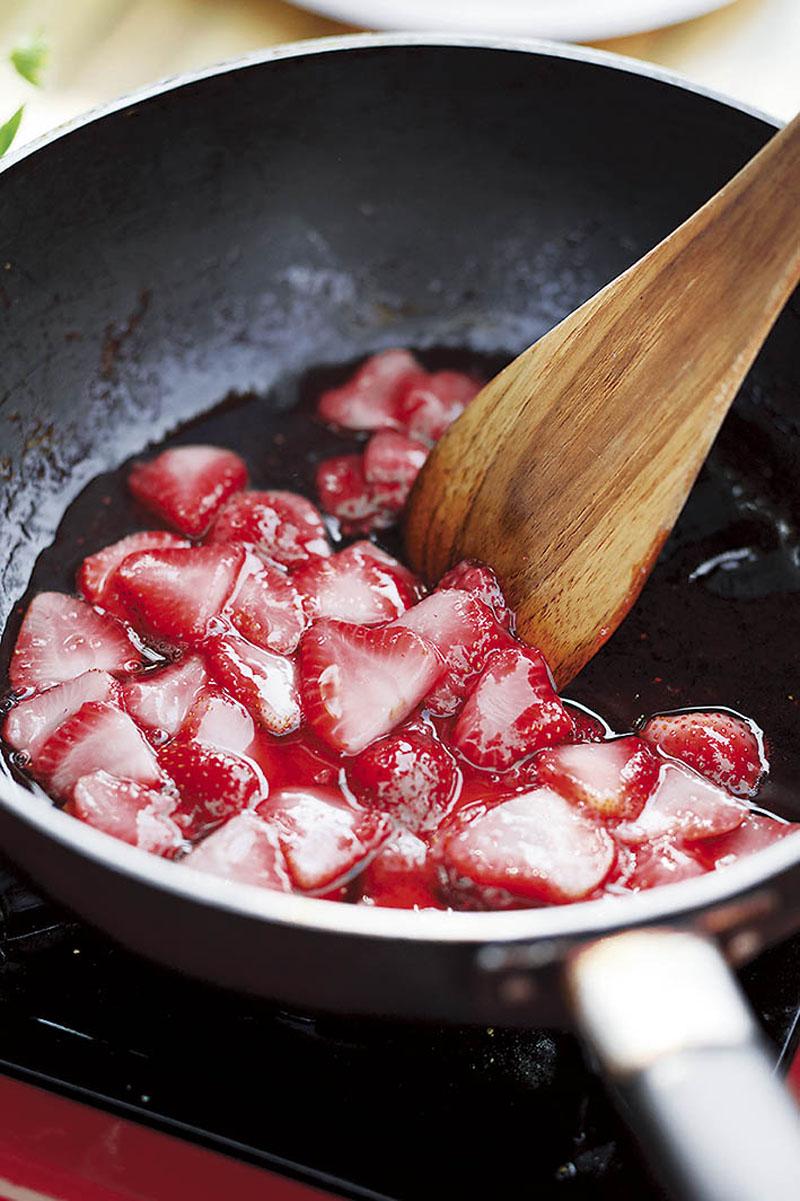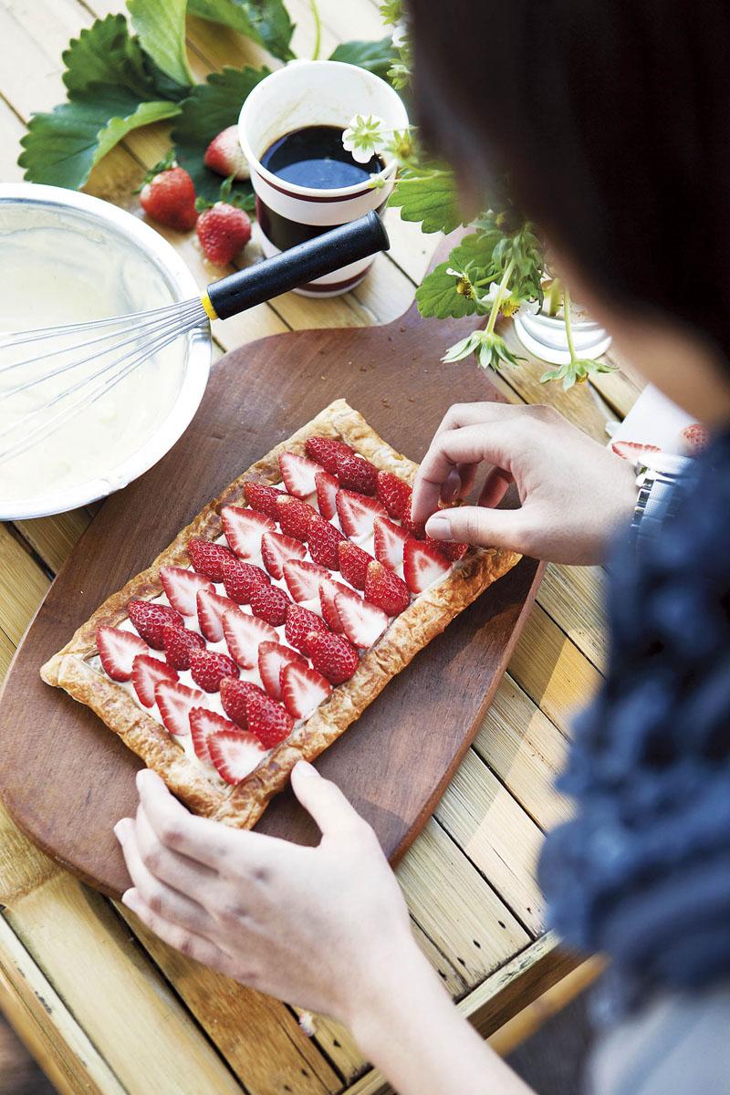 5. จัดเสิร์ฟโดยผสมครีมวานิลลากับวิปปิ้งครีมในอัตราส่วน 1 : 1 ให้เข้ากัน จากนั้นตักใส่กลางแผ่นแป้งที่อบไว้ในข้อ 4 แต่งหน้าด้วยสตรอเบอร์รี่ที่ผ่าครึ่งไว้ โรยใบสะระแหน่พร้อมเสิร์ฟ