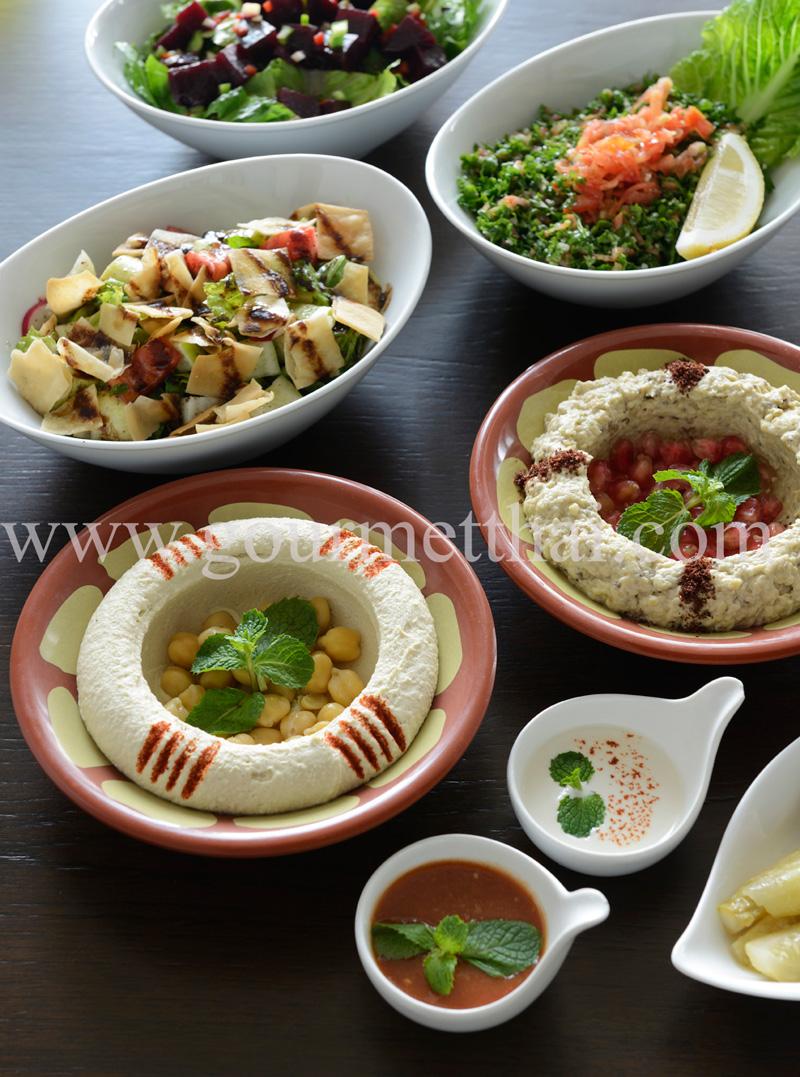 อาหารเรียกน้ำย่อยแบบเลบานีสเรียกว่า Mezza มีทั้งแบบเย็นและร้อน เช่น Taboule สลัดพาร์สลีย์สับกับสะระแหน่ น้ำเลมอน และน้ำมันมะกอก Fattouch สลัดผักใส่แป้งทอดกรอบกับน้ำสลัดทับทิม Hummus ถั่วลูกไก่บดผสมงา น้ำเลมอน และน้ำมันมะกอก รสมัน หอม อร่อย สูตรนี้เคยได้รับการโหวตให้เป็นอาหารที่ดีที่สุดในบรรดาอาหารบนสายการบินอาหรับมาแล้ว Mutable Batenjan มะเขือม่วงย่างบดผสมกับงา น้ำมะนาว และน้ำมันมะกอก ใส่เม็ดทับทิม แต่ถ้าชอบรสจัดควรลอง Walnut Muhamara วอลนัตบดผสมพริก รสชาติออกมันและเผ็ดเล็กน้อย