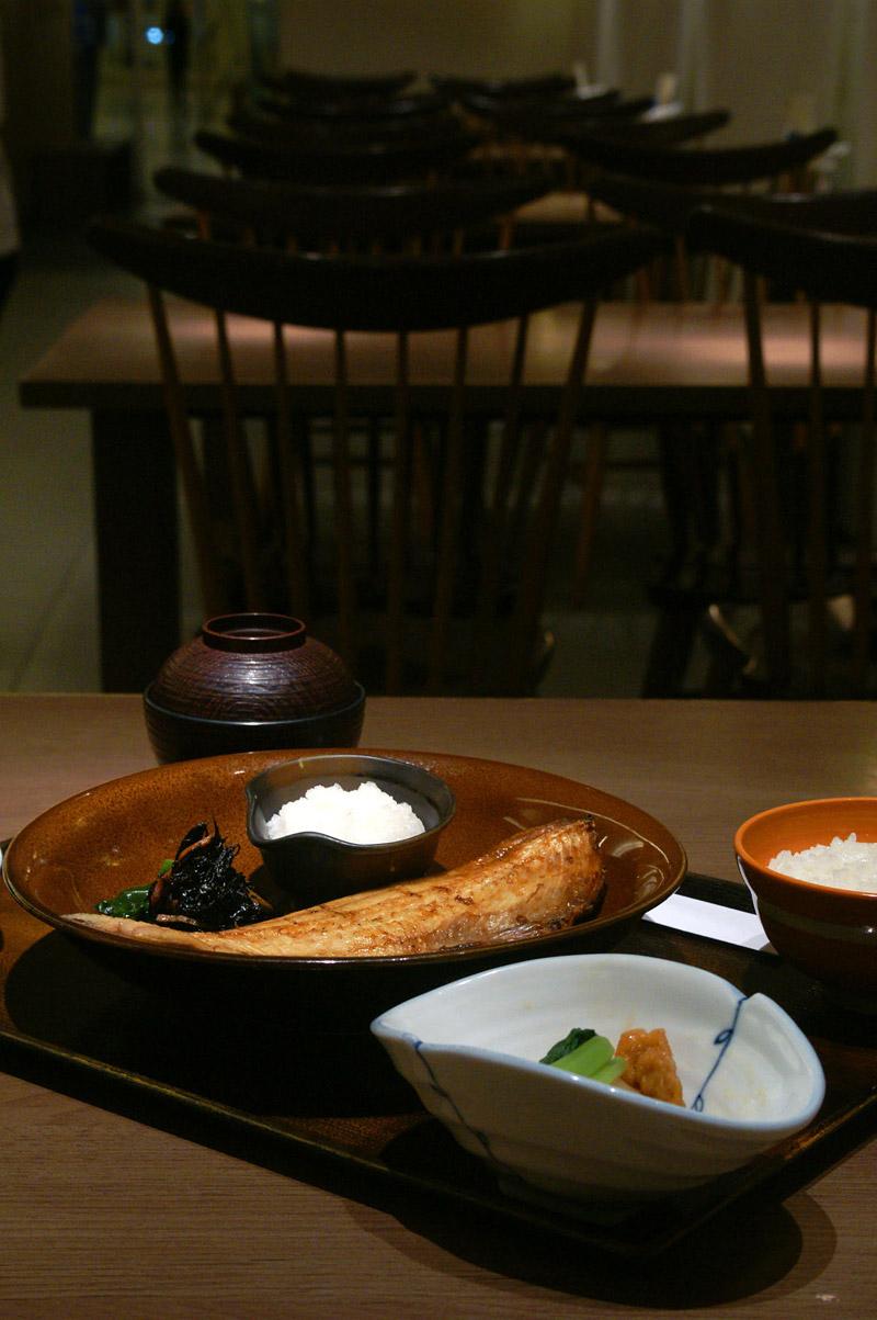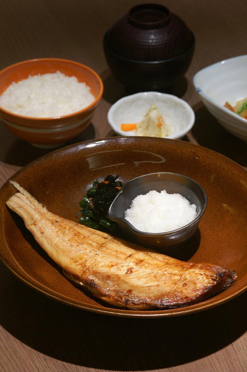 เมนูแรก – ชุดปลาชิมาฮอกเกะย่างถ่าน + ข้าว +หัวไชเท้า+ ผักโคบาจิ+สาหร่ายต้มกับโชยุ +มิโซะซุป