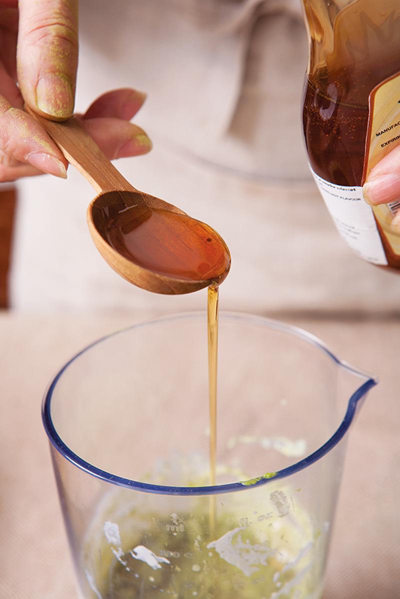 4. ผสมส่วนผสมข้อ 2 - 3 อะโวคาโด ผงมัตฉะเมเปิลไซรัป น้ำเลมอนลงในโถปั่น ปั่นให้เนียน เสร็จแล้วแช่เย็นไว้ให้เซตตัว