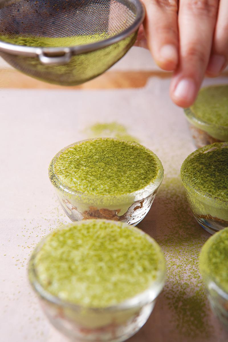 5. ตักมูสลี่ที่เตรียมไว้ใส่ภาชนะ ตามด้วยครีมปาดให้เรียบ แช่เย็นไว้ ก่อนเสิร์ฟโรยด้วยผงชาเขียวมัตฉะการลวกเต้าหู้ก่อนเป็นการฆ่าเชื้อและช่วยให้ขนมเก็บได้นานขึ้นเต้าหู้บางยี่ห้ออาจมีกลิ่นแรง ให้เพิ่มผงชาเขียวจะช่วยดับกลิ่นได้ หากต้องการทำขนมเป็นชั้นๆ หลังใส่ครีมในชั้นแรกควรแช่เย็นให้เซตตัวก่อนใส่ชั้นต่อไปหากมูสลี่ไม่มีรสหวานสามารถเพิ่มไซรัปในส่วนผสมได้
