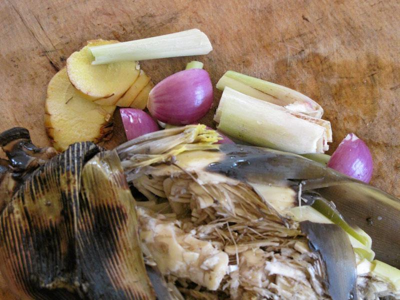 ต้มยำผีปู่ย่า เมนูขึ้นสำรับวันนี้ เป็นอาหารของคนเดินป่า ดังนั้นเครื่องปรุงจึงมีแต่ของที่หาได้ในป่า นำมาต้มมาแกงปรุงเป็นอาหารสำหรับกินประทังชีวิต และเชื่อกันว่าตามป่าตามเขาจะมีผีป่าเจ้าที่เฝ้ารักษา เหมือนบ้านที่อยู่อาศัยเช่นกัน ก็จะมีผีบ้านผีเรือน ดังนั้น ตามธรรมเนียมของคนเดินป่า ไม่ว่าจะเข้าไปทำงาน หาประโยชน์จากป่าหรือเข้าไปเที่ยว ก็จะต้องมีการเซ่นไหว้เป็นการคารวะ เพื่อให้ผีป่าเจ้าที่ช่วยคุ้มครองปกปัก รักษา จึงเป็นที่มาของชื่อเมนูอาหารในวันนี้