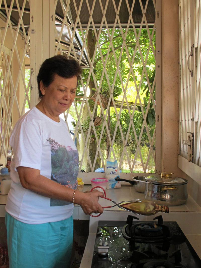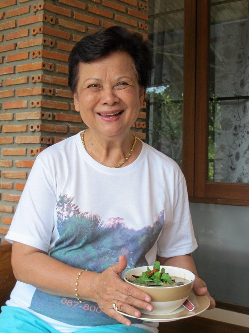 คุณแป๊ว–ดรุณี ศรีสนิท หญิงเก่งจอมโปรเจกต์ของครอบครัว ได้นำเมนูนี้มาขึ้นโต๊ะในวันเปิดร้านอาหารเหนือของเธอ ที่บ้านภูคำห้อม เขาใหญ่ ด้วยความที่คุณแป๊วชอบทำอาหารเป็นชีวิตจิตใจ ยิ่งอาหารเหนือ ซึ่งเป็นอาหารท้องถิ่นบ้านเกิด ที่ อ.แม่สอด จ.ตาก ด้วยแล้ว ขอให้บอก คุณแป๊วถนัดแทบทุกเมนู พอเริ่มว่างจากงานประจำที่สำนักงานที่ปรึกษากฎหมายระหว่างประเทศ เอนก กรุ๊ป ซึ่งมีทั้งลูกสาวและลูกชายเข้ามารับไม้ไปทำต่อหมดแล้ว คุณแป๊วจึงเริ่มคิดหาโปรเจกต์ทำให้ยุ่งขึ้นอีก ล่าสุดคิดทำรีสอร์ต แต่ขณะที่บ้านพักกำลังก่อสร้าง เธอก็เปิดร้านอาหารไปพลางๆก่อน ขายแต่อาหารเหนือ และอาหารยอดนิยมทั่วๆไป ซึ่งหนึ่งในเมนูเก๋ไก๋ที่ต้องสั่งคือ ต้มยำผีปู่ย่า หรือที่คุณแป๊วตั้งชื่อให้คนกินงงไปอีกว่า “ต้มยำญาติผู้ใหญ่”