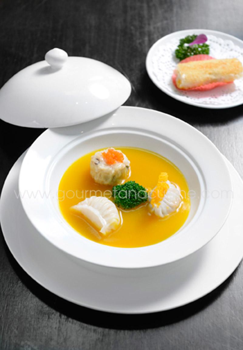 ติ่มซำอาหารหลักของอาหารกวางตุ้ง ร้านนี้ก็มีเหมือนร้านอื่น แต่ติ่มซำรวมที่มีเกี๊ยวจับจีบสวยและขนมจีบกุ้งวางในซุปฟักทองสีเหลืองสวย ทั้งดูสวยแปลกตากว่าที่เคยเห็นและอร่อยอย่างไม่มีตกหล่น ก๋วยเตี๋ยวหลอดกุ้ง เนื้อแป้งบาง นุ่มเหนียว ฮะเก๋ากุ้ง กุ้งตัวโตเนื้อหวานกรอบ อร่อยเต็มปากเต็มคำ เสี่ยวหลงเปาเสิร์ฟในถ้วยอะลูมิเนียมฟอยล์ใบเล็ก ชิ้นอ้วนโตที่มีน้ำซุปรสอร่อย ต้องระวังอย่าให้แตกก่อนเข้าปาก เพราะจะรู้สึกอดเสียดายไม่ได้ และห้ามพลาดสำหรับคนรักหมูกรอบ เพราะหนังบาง กรอบ เนื้อหมูไม่ติดมัน รสชาติกำลังอร่อย และควรห้ามใจอย่าเพิ่งสั่งเบิล เพราะยังมีจานหลักให้เลือกอีก