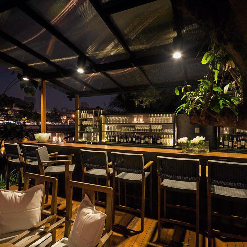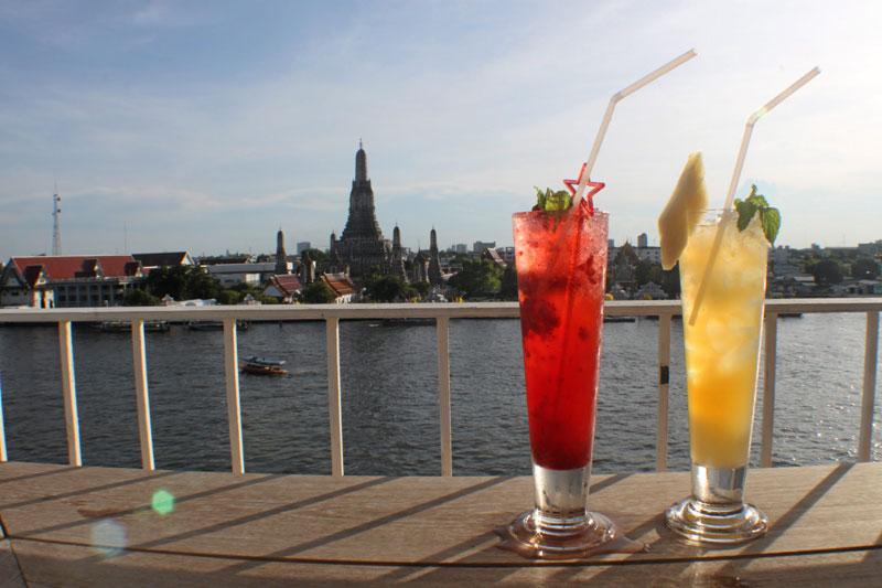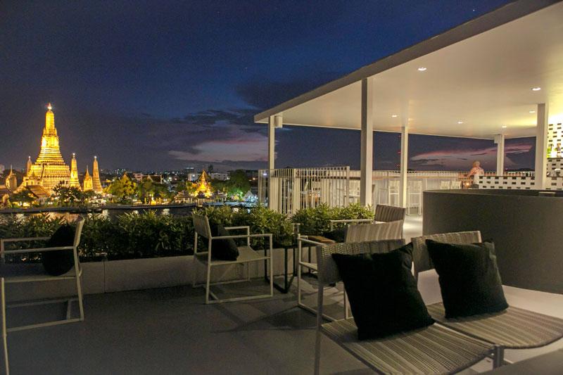 ตามติดมาด้วย “Sala Rattanakosin” ศาลา รัตนโกสินทร์ ตั้งอยู่ริมแม่น้ำเจ้าพระยา ตรงข้ามวัดอรุณ เข้าทางซอยท่าเตียน โอบล้อมไปด้วยวัดวาอาราม, โบราณสถานสำคัญ และย่านเมืองเก่าของกรุงเทพมหานคร จุดเด่นของ “ศาลารัตนโกสินทร์” อยู่ที่ชั้นดาดฟ้า เนรมิตเป็น Sky Bar เปิดโล่งเห็นทิวทัศน์ของเกาะรัตนโกสินทร์แบบ 360 องศา มองเห็นความงามของวัดอรุณ, วัดโพธิ์, วัดพระแก้ว, วัดโมลีโลกยาราม และวัดกัลยาณมิตร เหมาะแก่การนั่งจิบค็อกเทลแก้วโปรด และชมพระอาทิตย์ตกดิน ในบรรยากาศริมแม่น้ำเจ้าพระยา ที่สวยงามเกินบรรยาย เมื่อต้องแสงอาทิตย์สุดท้ายของวัน ที่นี่ยังมีบริการอาหารไทย-ยุโรปสไตล์ฟิวชั่น ปรุงโดยเชฟชื่อดังชาวอังกฤษ “มร.โทนี่ ริกลีย์” ให้ได้อร่อยตลอดทั้งวัน โดยเมนูอร่อยสร้างชื่อ มีอาทิ ยำปูนิ่มทอดมะม่วง, ปลาหมึกชุบแป้งทอดหมักเกลือโรยพริกไทย, ฉู่ฉี่รวมมิตรทะเล, หมูกรอบสไตล์อังกฤษ, แกงเผ็ดเป็ดย่าง และซุปมะเขือเทศเย็นตำรับสเปน