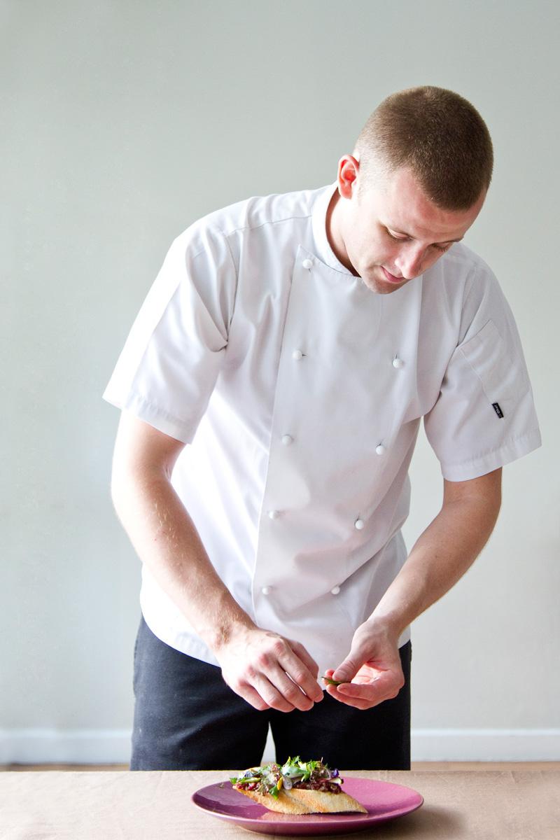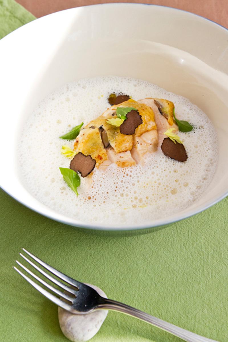 อกไก่สดจากฟาร์มสอดไส้ด้วยเห็ดทรัฟเฟิลฝานบางๆ ใต้หนังไก่ แล้วนำไปจี่ในกระทะร้อนๆ วางบนมันฝรั่งบดใส่ทรัฟเฟิลและเนย ราดซอสไก่สีน้ำตาลและครีมโฟมไก่เข้มข้นที่เบานุ่มเข้ากันได้ดี
