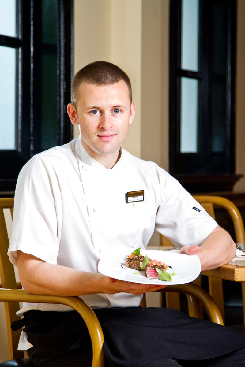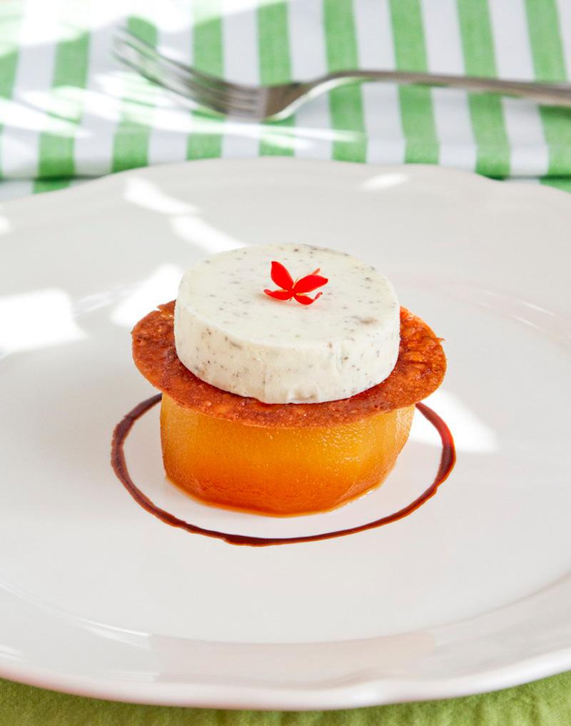 ไอศกรีมกลิ่นวานิลลาผสมเห็ดทรัฟเฟิลและน้ำมันทรัฟเฟิล รองด้วยบิสกิตช็อกโกแลตรสส้มแผ่นบางๆ (เรียกว่า “tuile”) เสิร์ฟบนลูกแพร์แดงอบคาราเมล ที่ยัดไส้ด้วยด้วยครีมคาราเมล ตกแต่งจานด้วยซอสช็อกโกแลตผสมเครื่องเทศเพื่อให้จานนี้น่าสนใจยิ่งขึ้น