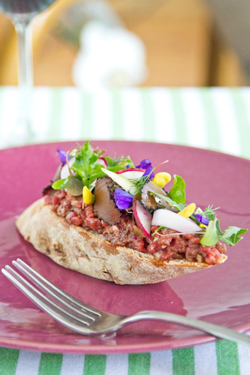เนื้อวัวเทนเดอร์ลอยน์หั่นเป็นชิ้นเล็กๆ ปรุงด้วยซอสบัลซามิก มัสตาร์ด และเห็ดทรัฟเฟิล โรยด้วยเครื่องเทศ สลัดใบเล็ก ดอกไม้ และเห็ดทรัฟเฟิลฝานบางๆ เสิร์ฟบนขนมปังกรอบอร่อย เหมาะสำหรับเป็นเมนูเรียกน้ำย่อย