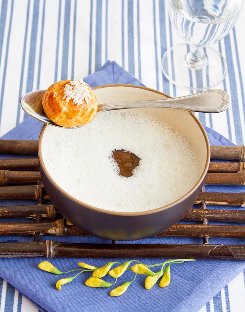 ซุปเห็ดอิตาเลียน Porchini เข้มข้น ราดด้วยครีมโฟมเห็ดทรัฟเฟิลสกัด โดยมีเห็ดทรัฟเฟิลฝานบางๆวางข้างบนอีกชั้นหนึ่ง เสิร์ฟพร้อมขนมปัง Choux ยัดไส้ครีม bechamel ที่โรยด้วยชีสพาเมซาน สร้างสมดุลที่สมบูรณ์ในรสชาติและเนื้อครีมได้อย่างน่าอัศจรรย์