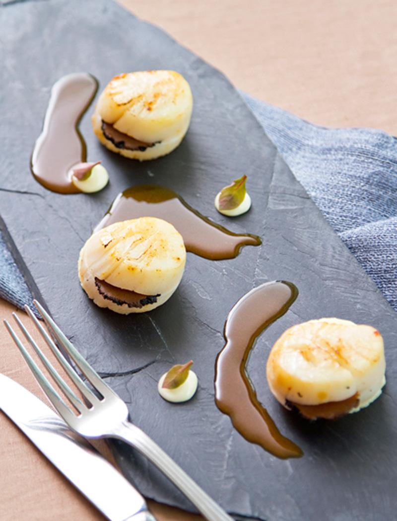 หอยเชลล์ฮอกไกโดสดถูกคัดอย่างดีนำไปจี่ (สะดุ้งไฟ) บนกะทะจนนุ่มแต่ยังชุ่มน้ำอยู่ ยัดไส้ด้วยเห็ดทรัฟเฟิลฝานบางๆ เสิร์ฟบนมันฝรั่งออร์กานิกบดอบเนยราดด้วยซอสไก่สีน้ำตาลที่เคี่ยวจากกระดูกไก่อย่างดี ซึ่งทำให้เมนูจานนี้สมบูรณ์ยิ่งขึ้น