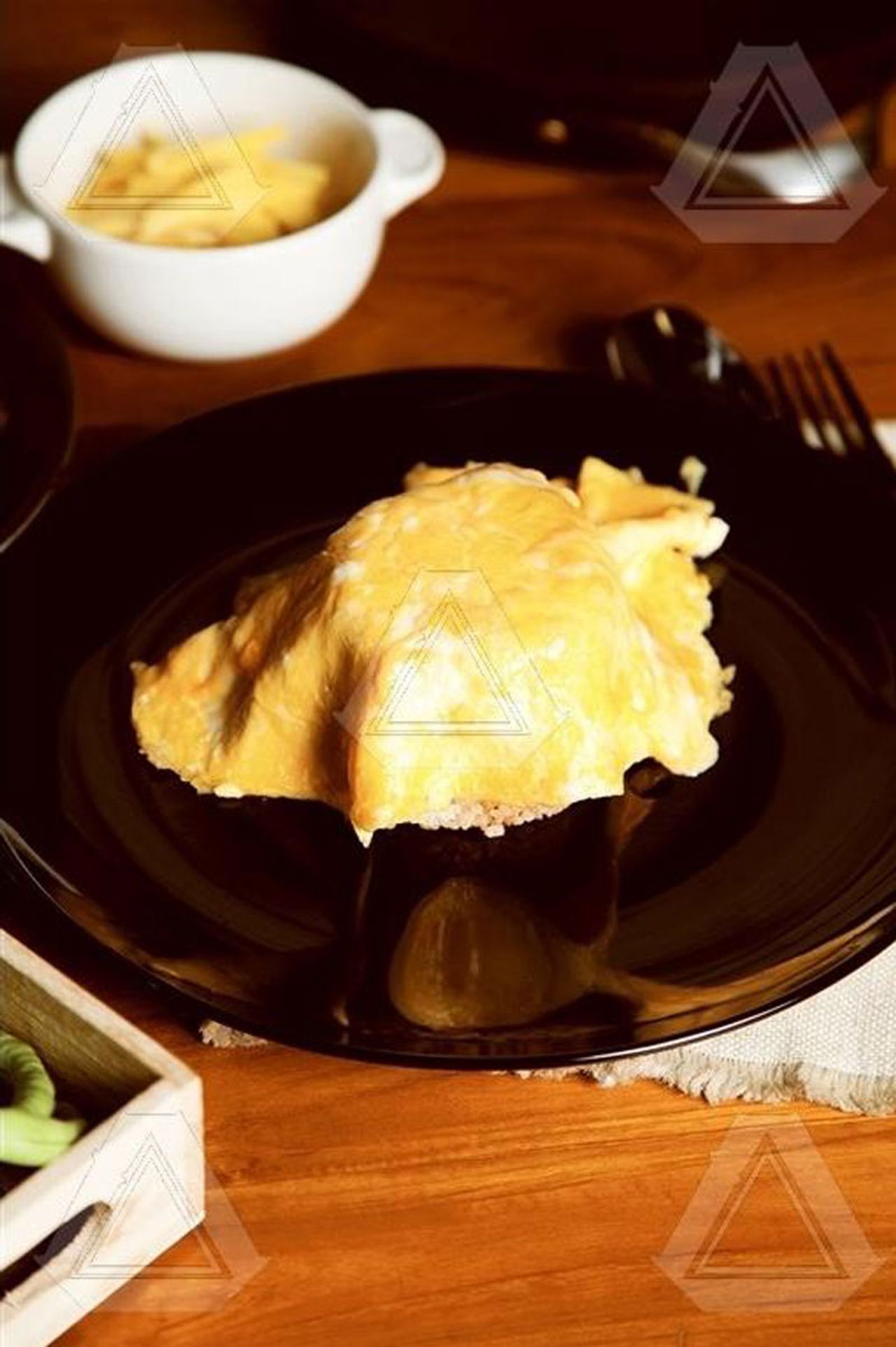 3. ทำไข่ข้นโดยตีไข่กับนมสดให้เข้ากัน ตั้งกระทะไฟกลาง เทไข่ลงในกระทะ กลอกไข่ให้แผ่ทั่วกระทะ สังเกตไข่เริ่มสุกแต่ตรงกลางยังไม่สุกเล็กน้อยปิดไฟ