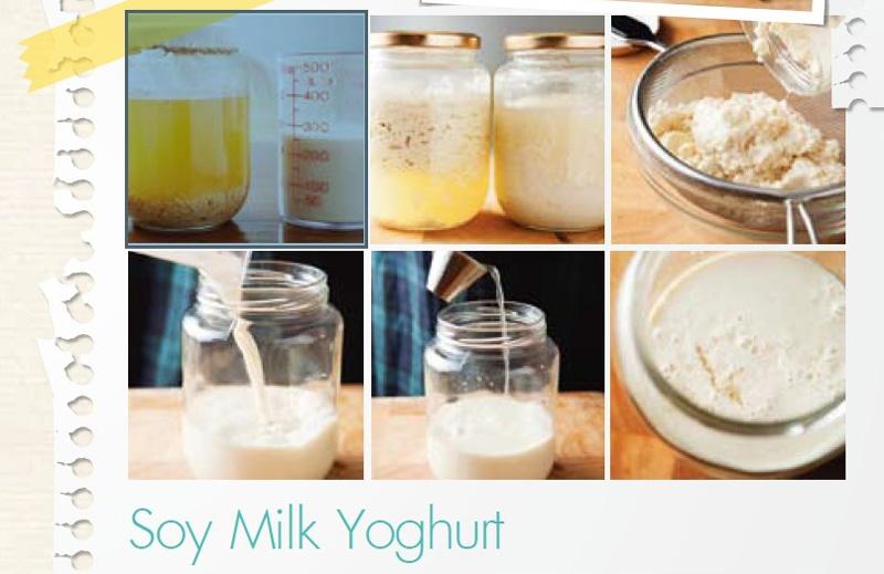 ส่วนผสมน้ำนมถั่วเหลืองจืด 250 มิลลิลิตร | น้ำหมักข้าวกล้อง 50 มิลลิลิตร วิธีทำ ทำความสะอาดภาชนะด้วยวิธีข้างต้น คีบโหลออกมาไม่ต้องเช็ดแล้ว ใส่น้ำนมถั่วเหลือง น้ำหมักข้าวกล้องลงผสม ปิดฝา วางไว้ที่อุณหภูมิห้อง 3-4 วัน เมื่อนมถั่วเหลืองเริ่มจับตัว แยกชั้น ให้เทน้ำออก กรองเอาแต่เนื้อโยเกิร์ตมาปั่นให้เนียน แช่เย็น ตักเสิร์ฟพร้อมผลไม้ มูสลี่ น้ำผึ้ง และถั่วตามชอบ หรือจะนำมาปั่นผสมกับน้ำส้มในอัตราส่วนที่เท่ากัน ก็จะได้นมเปรี้ยวรสผลไม้ไว้ดื่ม