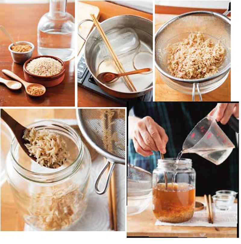 วิธีทำ เริ่มจากต้มโหล ฝา และช้อนสำหรับคนในน้ำเดือดประมาณ 5 นาทีเพื่อฆ่าเชื้อ จากนั้นซาวข้าว 1 ครั้ง เทใส่โหลโดยไม่ต้องเช็ดโหลให้แห้ง ใส่น้ำตาล เกลือ และน้ำสะอาด ใช้ช้อนคนให้เข้ากัน ปิดฝา ตั้งไว้ที่อุณหภูมิห้อง หรือตากแดดไว้ประมาณ 3 วัน จะสังเกตเห็นฟองขึ้นมาให้ลองเปิดดม ถ้ากลิ่นเหมือนของหมักดองแปลว่าใช้ได้ แต่ถ้ากลิ่นเหม็นเน่าแสดงว่าเสีย ซึ่งอาจเกิดจากภาชนะไม่สะอาดพอ เมื่อได้ที่แล้วให้เก็บโหลไว้ในตู้เย็นเพื่อชะลอการเติบโตของจุลินทรีย์ และหมั่นนำออกมาคลายฝาเพื่อระบายก๊าซออก