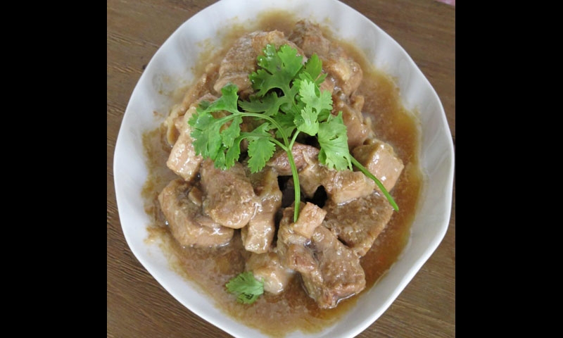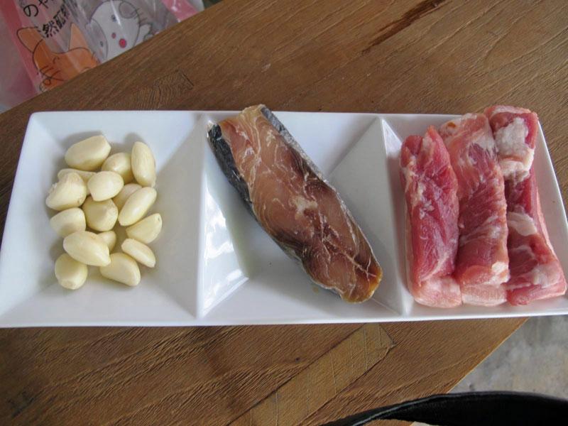 เครื่องปรุงประกอบด้วย : หมูสามชั้น 6–8 ขีด/ปลาเค็ม/กระเทียม 2–3 หัว/ซีอิ๊วขาว/ซีอิ๊วดำ/น้ำตาลทราย.....วิธีทำ 1) นำหมูสามชั้นไปต้มให้สุก แล้วเก็บน้ำซุปไว้ด้วย 2) หั่นหมูที่ต้มแล้วเป็นชิ้นๆค่อนข้างหนา แล้วต้มกับน้ำซุป พร้อมกับเติมซีอิ๊วขาว น้ำตาลทราย และปลาเค็มเล็กน้อย เคี่ยวไปจนหมูสามชั้นเริ่มเปื่อย ประมาณ 2 ชั่วโมงได้ 3) จึงทุบกระเทียมใส่ลงไปมากหน่อย เคี่ยวจน กระเทียมเปื่อยและน้ำซุปลดลง เหลือน้ำขลุกขลิก 4) เติมน้ำมันลงไปนิดหน่อย เพื่อให้เป็นมันเงา 5) เติมซีอิ๊วดำนิดหน่อย เพื่อให้มีสีสัน