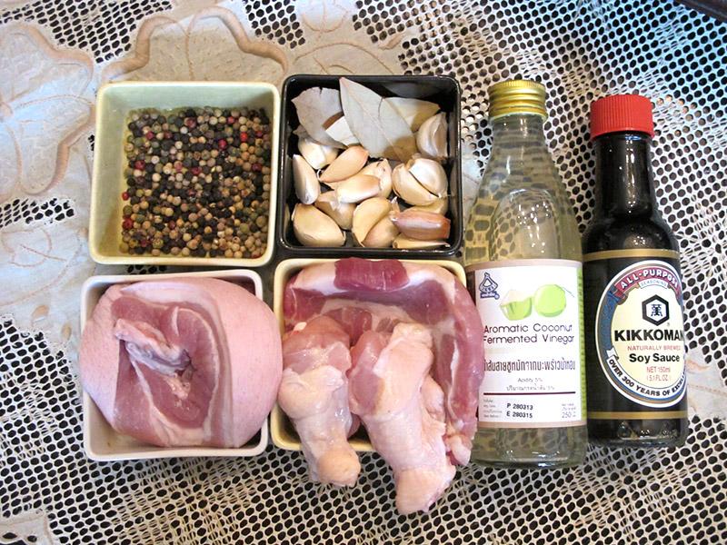 เครื่องปรุง : หมูสามชั้นและเนื้อหมูส่วนสะโพก/ไก่ หรือปีกบนไก่ รวมกันทั้งหมูและไก่ 1/2 กก./กระเทียม/พริกไทยดำแบบเม็ดๆ/ใบกระ-วาน (Bay Leaf)/ซีอิ๊วคิกโคแมน/น้ำส้มมะพร้าว หรือน้ำส้มสายชู.......