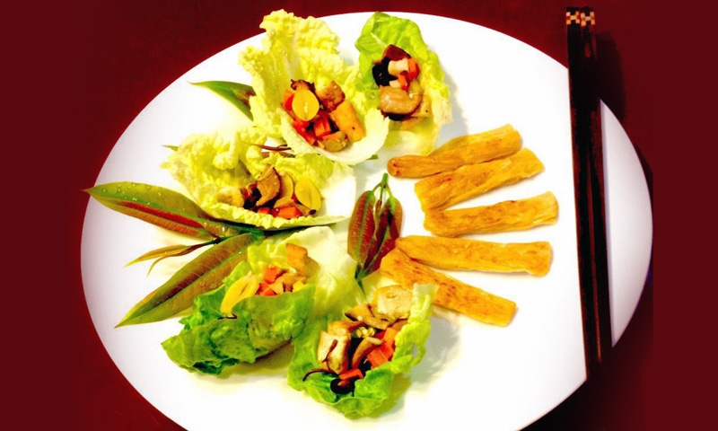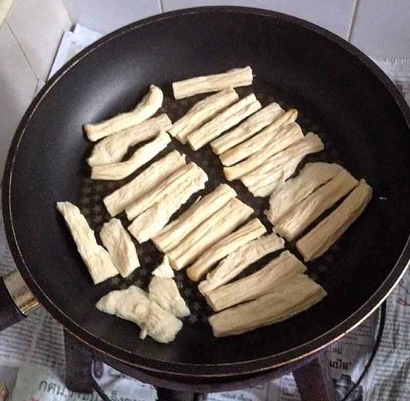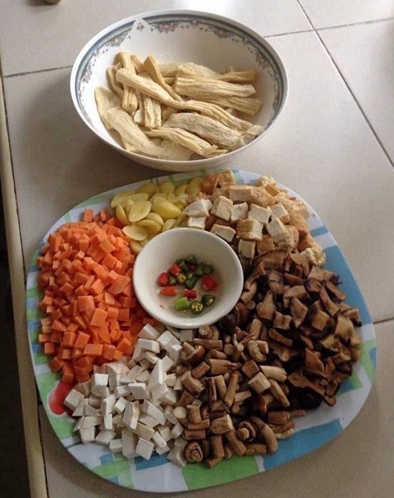 สำหรับ “เมี่ยงฟองเต้าหู้” เมนูเจที่คุณอ้วนคิดขึ้นเอง ตามวัตถุดิบที่มีในตู้เย็น เป็นอาหารว่างทานเล่นๆแต่ได้สุขภาพ เครื่องปรุง : ฟองเต้าหู้ /เห็ดหอมคั่ว/แปะก๊วยต้มสุก/แครอทหั่นลูกเต๋า/เต้าหู้ปลาเจ/เต้าหู้เหลืองย่าง/ พริกขี้หนูสวน/ผักสลัด......วิธีทำ 1) นำฟองเต้าหู้ไปย่างบนกระทะให้แห้ง แล้วโรยเกลือเล็กน้อย 2) นำเครื่องทั้งหมดตั้งแต่ เห็ดหอมคั่ว, แปะก๊วยต้มสุก, แครอทหั่นลูกเต๋า, เต้าหู้ปลาเจ, เต้าหู้เหลืองย่าง มาผัดรวมกันด้วยไฟอ่อนๆ ด้วยน้ำมันมะกอก และปรุงรสด้วยซีอิ๊วเจกับน้ำตาลทรายให้ได้รสชาติตามชอบ ทานแบบเมี่ยงพร้อมกับผักกาดหอมหรือผักสลัดตามชอบ.