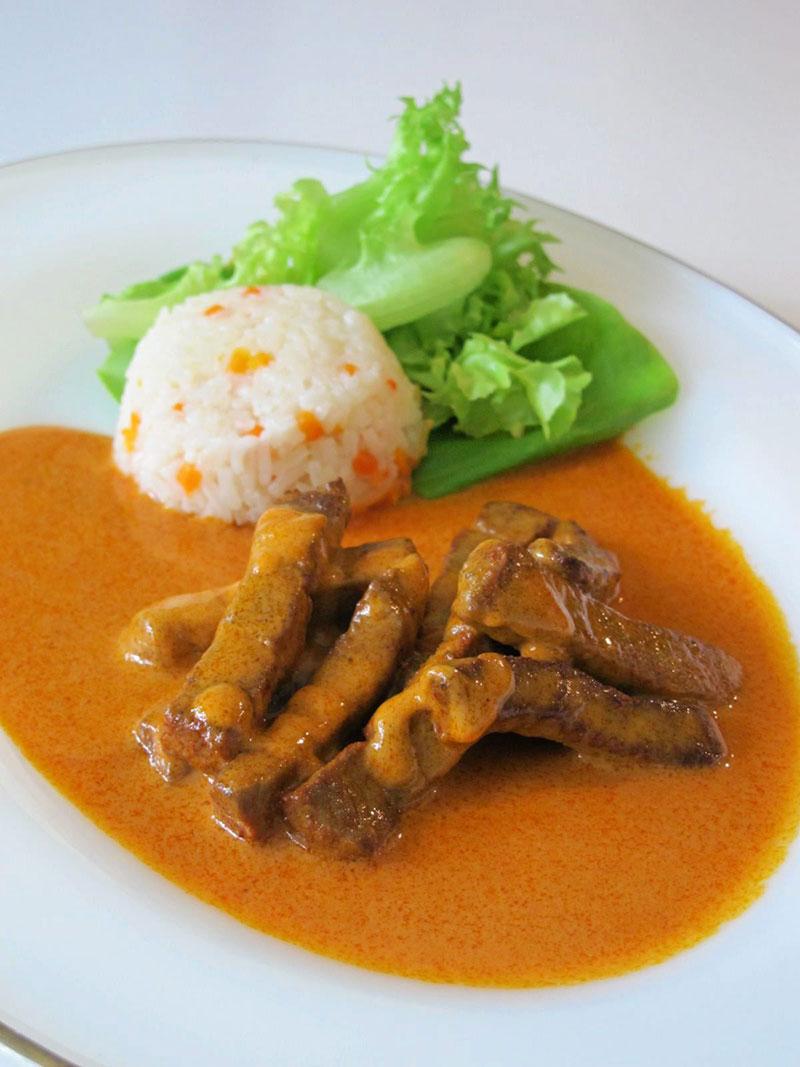 เครื่องปรุง : เนื้อสันใน 500 กรัม/หัวหอมสับ 200 กรัม/มะเขือเทศปอกเปลือกสับ 2 ลูก/มะเขือเทศบดเข้มข้น (Tomato Paste) 1 ช้อนโต๊ะ/วิปครีม 200 มล./เนย 50 กรัม/พริกปาปริก้าผง 1 ช้อนโต๊ะ/ใบกระวาน 2 ใบ/กระเทียมทุบ 2-3 กลีบ/น้ำสต๊อกเนื้อ 400 มล./ไวน์ขาว 30 มล./เกลือและพริกไทย