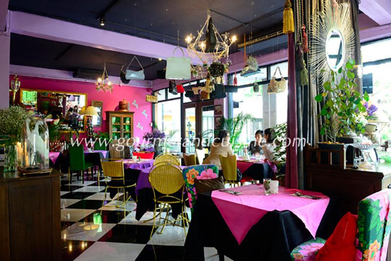 โดยเฉพาะโต๊ะ เก้าอี้ไม้ เคาน์เตอร์ไม้ ตู้ไม้ ที่ได้มาจากพม่า จึงไม่ต้องแปลกใจที่จะได้นั่งกินข้าวบนโต๊ะไม้สักแผ่นใหญ่แข็งแรงไม่มีรอยต่อ หรือโต๊ะไม้ที่เคยเป็นโต๊ะเขียนหนังสือมาก่อน ผ้าคลุมโต๊ะลายพื้นและดอกสีสดใสตัดกับผนังสีฉูดฉาด เข้ากับโคมไฟรูปดอกไม้และม่านไฟดอกชบาที่เจ้าของร้านบอกว่าได้มาจากรัสเซีย รูปสัตว์ติดฝาผนังได้มาจากแอฟริกา มีสร้อยคอสีสันลายแปลกแขวนอยู่ ซึ่งก็คือของสะสมของเจ้าของร้านอีกเช่นกัน นอกจากนี้ยังมีมุมโซฟาผ้าบุลายดอกเหมือนห้องรับแขกที่จัดไว้เชื้อเชิญให้มานั่งดื่มชาพร้อมของตกแต่งกระจุกกระจิกดูเพลินไม่เบื่อ