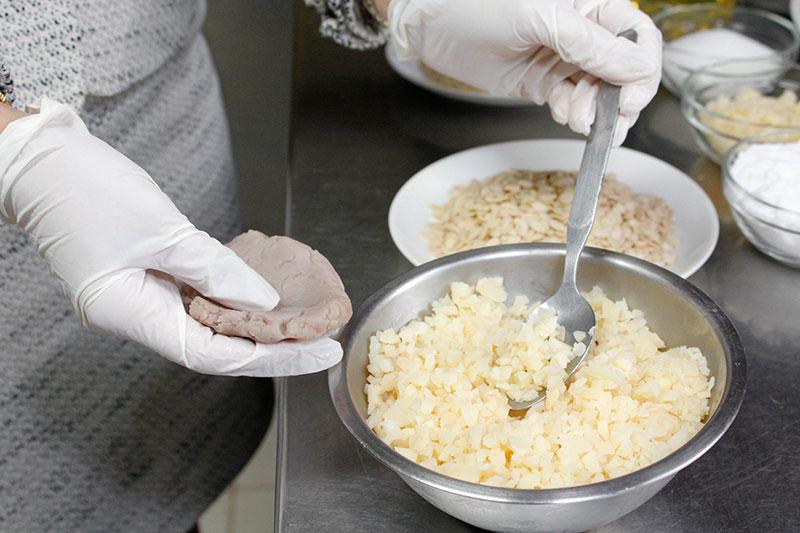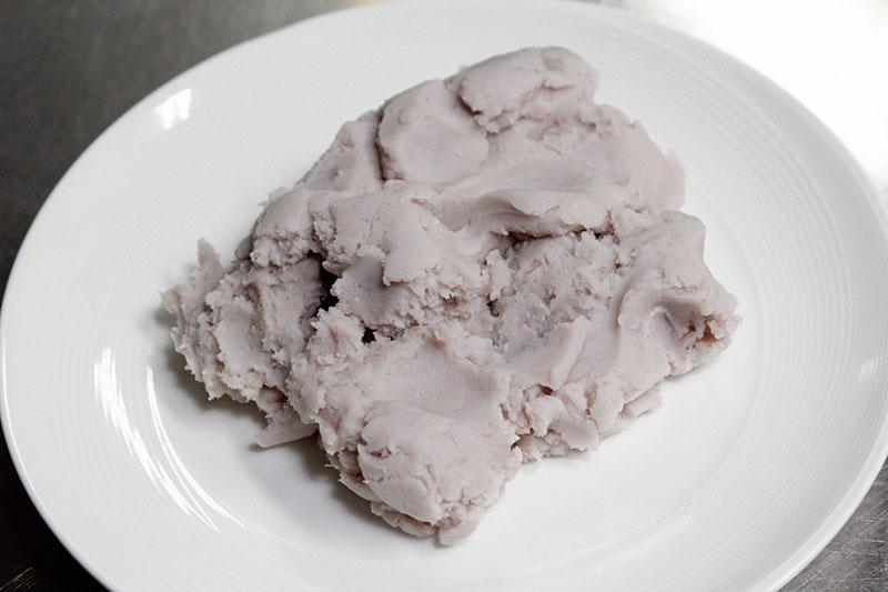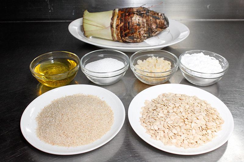 ส่วนผสม : เผือก 1 หัว/น้ำตาลทราย 1 ถ้วย/เม็ดกวยจี๊ 1 ถ้วย/งาขาว 1 ถ้วย/แป้งข้าวเจ้า 1 ถ้วย/แห้วจีน 1/2 กิโลกรัม/น้ำมันพืช 1 ลิตร.....วิธีทำ 1) เริ่มตั้งแต่การเลือกเผือกที่มีเนื้อร่วนซุย นำมาปอกเปลือก ล้างให้สะอาดแล้วหั่นเป็นชิ้นๆ นำไปนึ่งให้สุกแล้วยีให้ละเอียด 2) นำไปกวนในกระทะทองเหลือง (เพื่อกันไม่ให้ติดก้นภาชนะ ซึ่งอาจจะไหม้ได้ง่าย) 3) เติมน้ำตาลทรายให้มีรสชาติหวานเล็กน้อย พักไว้ให้เย็น 4) นำแห้วจีนต้มให้สุกแล้วปอกเปลือก หั่นเป็นชิ้นลูกเต๋าเล็กๆ 5) นำเผือกมาปั้นเป็นก้อนรูปวงรี ใส่ไส้แห้ว ห่อพับเข้าหากันจนมิดไม่เห็นไส้ 6) ชุบด้วยเม็ดกวยจี๊ที่คลุกเคล้ากับงาขาวผสมแป้งข้าวเจ้าไว้แล้ว 7) ตั้งกระทะ รอจนน้ำมันเดือดจึงนำลงทอดให้มีสีเหลืองทอง