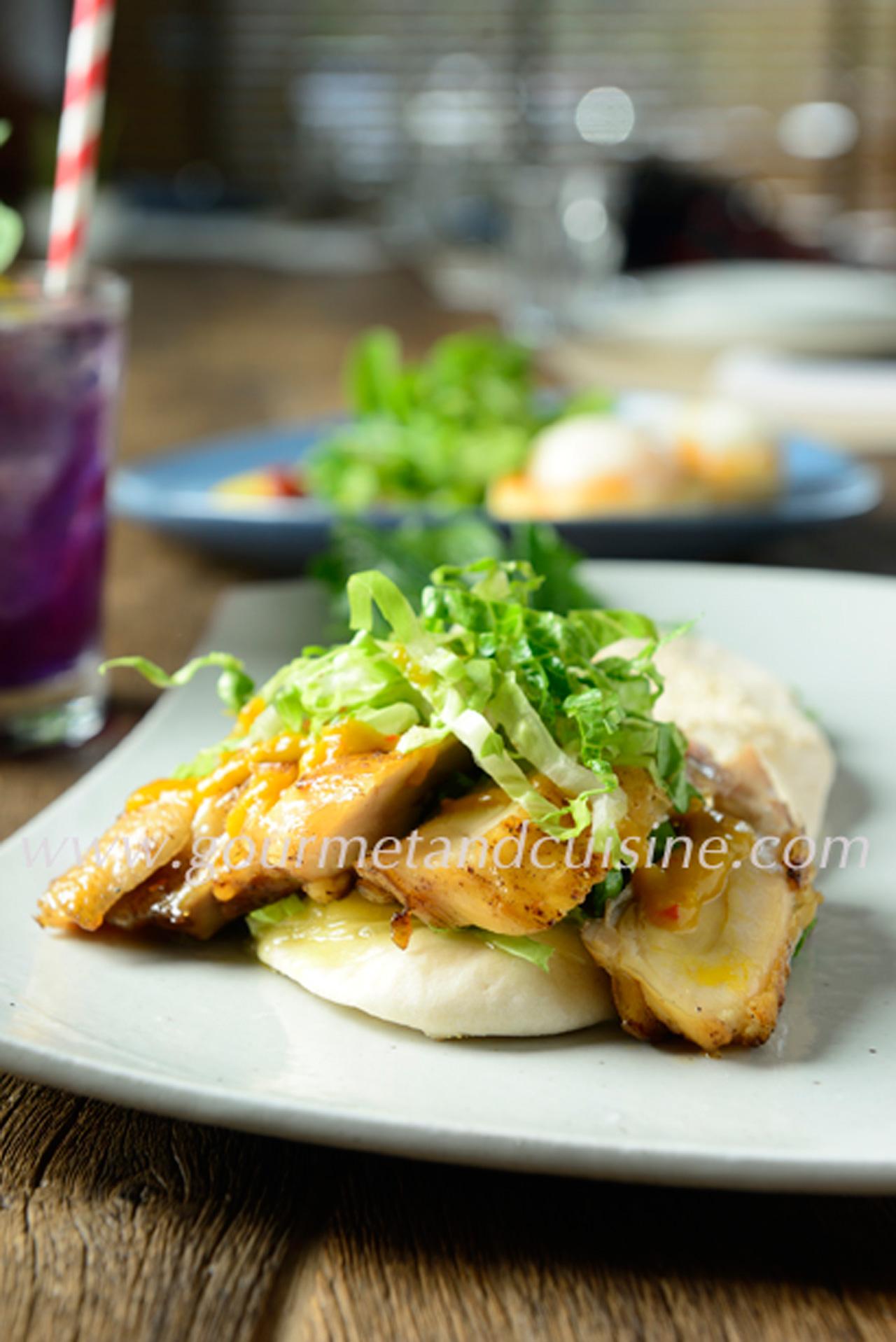 อีกจานก็น่าสนใจ Fiery Chicken Sandwich พิตาเบรดโปะหน้าด้วยไก่ย่าง หอมกรุ่นกลิ่นเครื่องเทศ ชีส และผัก เพียงพับก็กลายเป็นแซนด์วิชง่ายๆ กินกับ Blue Butterfly ชาเขียวกับใบมินต์ อัญชัน และเลมอน ก็ให้อารมณ์สไตล์เมดิเตอร์เรเนียน