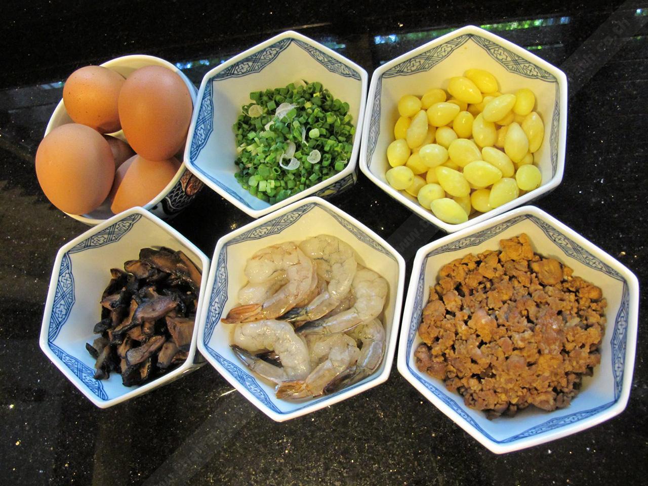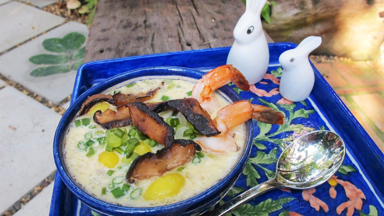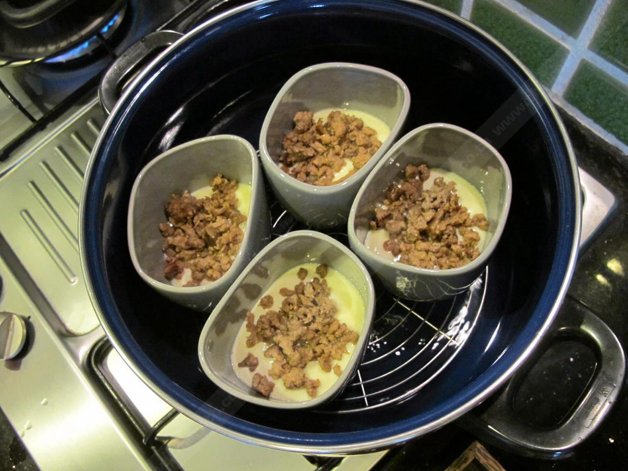 เครื่องปรุง : ไข่ไก่ 7 ฟอง/น้ำซุปไก่ 4 ถ้วยจากโครงไก่ 1 ตัว/ แปะก๊วยต้ม/เห็ดหอม/หมูสับ/กุ้งขาวแกะเปลือกเหลือไว้แต่หางและผ่ากลางหลัง/ซีอิ๊วขาว 4 ชต./ซีอิ๊วดำ/น้ำตาล/ พริกไทยป่น (ถ้าชอบ)/ต้นหอมซอย...วิธีทำ 1) ผัดหมูสับปรุงรสด้วยซีอิ๊วขาว น้ำตาล และแต่งสีด้วยซีอิ๊วดำ พยายามยีเนื้อหมูไม่ให้จับกันเป็นก้อน 2) เห็ดหอม หั่นชิ้นยาว คั่วไฟ ให้หอม 3) ตอกไข่ ใช้ตะเกียบคีบไข่ขึ้นลง จนไข่ขาวกับไข่แดงเป็นเนื้อเดียวกัน อย่าใช้วิธีตีให้เข้ากัน 4) เติมน้ำซุปไก่ลงผสมกับไข่ ปรุงรสด้วยซีอิ๊วขาว พริกไทย (ถ้าชอบ) กรองด้วยกระชอนตาถี่ ประมาณ 3 รอบ 5) รินไข่ใส่ถ้วยราว 1/3 ของถ้วย วางลงในหม้อนึ่ง ที่ตั้งน้ำจนเดือด นึ่งไฟแรงในช่วงแรก และลดไฟ เมื่อไข่สุก ใส่หมูสับปรุงรส ตามด้วยไข่ที่เหลือจนเกือบเต็มถ้วย 6) นึ่งไปอีกระยะใส่ส่วนผสมที่เหลือ มีกุ้งขาว แปะก๊วย เห็ดหอม ต้นหอม เรียงกันให้สวยงาม นึ่งต่อจนสุก