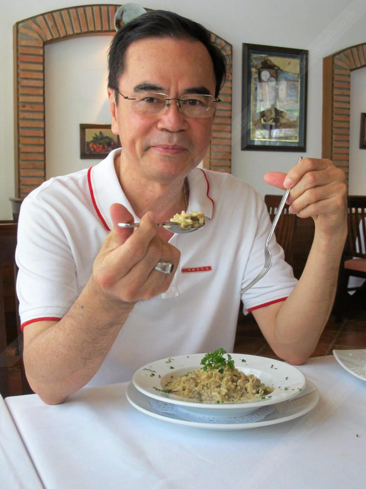 คุณเด่นแนะนำว่า ถ้าเปลี่ยนจากเห็ด เป็นกุ้งสแคมปี้ Scampi ต้องใช้ น้ำซุปกุ้ง แล้วข้าวผัดจานนี้ก็จะได้รสชาติหอมไปอีกแบบ และข้าวรีซอตโต้ต้นตำรับของอิตาเลียน จะทานแบบสุกไม่เต็มร้อย มีกรุบเล็กน้อย แต่ถ้าให้ถูกปากคนไทย จะเน้นข้าวสุกแบบไม่เป็นไต.