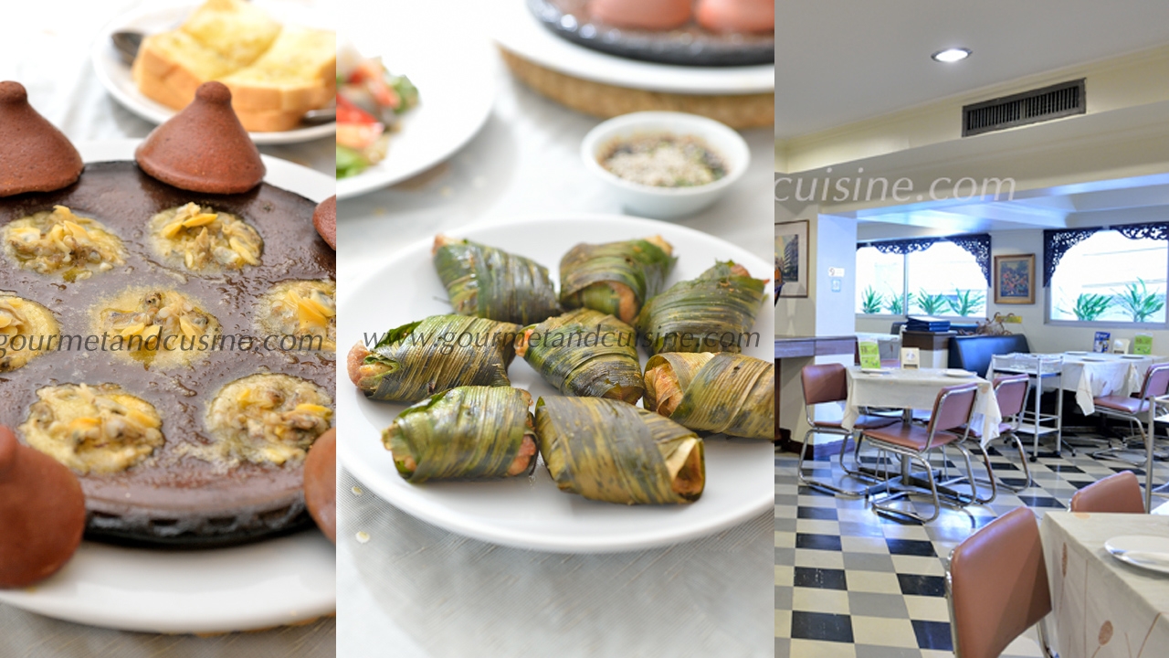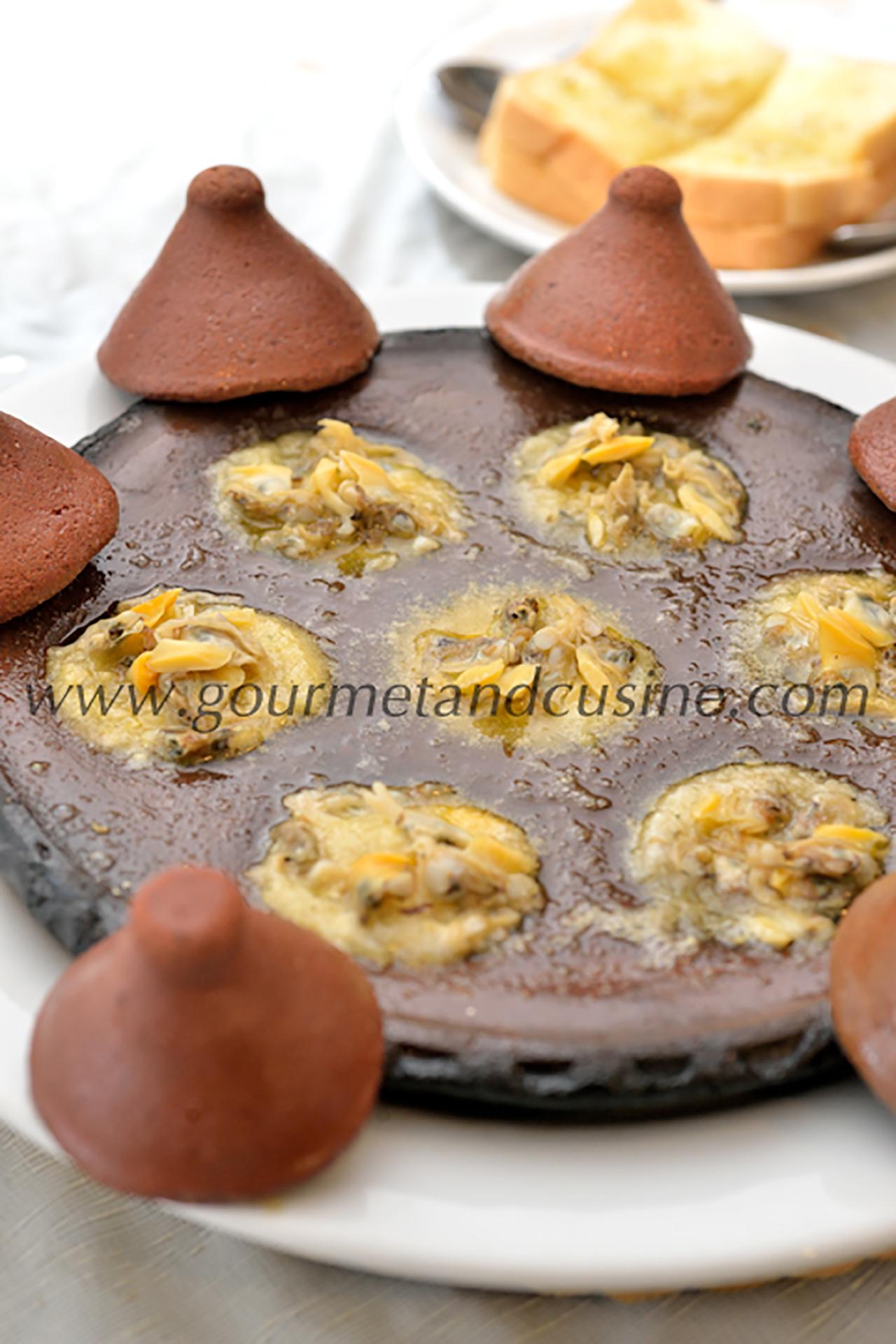 จานแรก หอยลายบ้านกล้วย คล้ายหอยอบเนยกระเทียมอย่างฝรั่ง แต่ใช้หอยลายที่มีกลิ่นรสเฉพาะตัวอบกับเนยกระเทียมในเตาขนมครก กินคู่กับขนมปังเนยกระเทียม